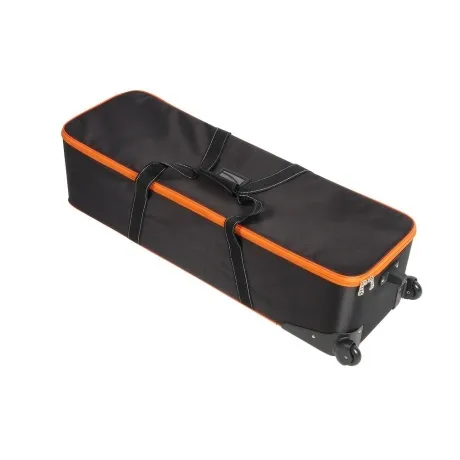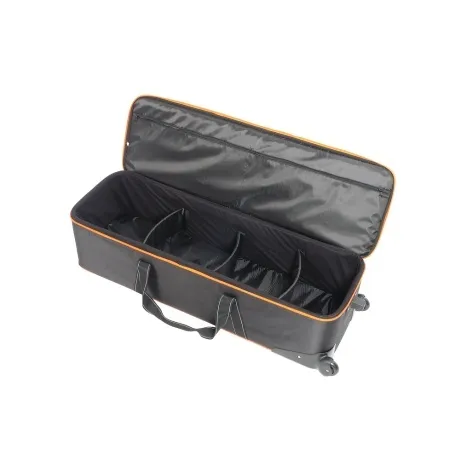 Falcon Eyes СС-12 – вместительная сумка для перевозки студийного оборудования. Содержимое сумки оберегают прочный каркас – монолитный полимерный короб со стенками толщиной 6 мм, жесткое дно и амортизирующая внутренняя отделка. Удобно и компактно разместить вспышки, стойки и аксессуары помогают перегородки с креплением-липучками, зафиксировать оборудование можно ремнями-стяжками. Для аксессуаров можно использовать два кармана длиной по 48 см с застежкой-молнией, которые находятся на внутренней стороне крышки. Плавный ход обеспечивают два колеса на стальных осях, защищенные кожухами.