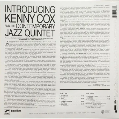 Introducing Kenny Cox - дебютный студийный альбом пианиста Кенни Кокса, выпущенный в 1968 году. Песни записаны с участием квинтета Кокса The Contemporary Jazz Quintet, в котором состоят Чарльз Мур (клавиши), Леон Хендерсон (тенор саксофон), Рон Брукс (бас) и Дэнни Спенсер (ударные). Аудиофильское ремастрированное переиздание 2021 года с оригинальных аналоговых мастер-лент издание на 180-граммовом чёрном виниле в серии Blue Note Classic Vinyl Series. Кенни Кокс - американский джазовый пианист, игравший в стиле пост-боп, хард-боп и бибоп. Он начинал как аккомпониатор, затем в 1960- е годы создал свой квинтет The Contemporary Jazz Quintet. За свою карьеру музыкант выпустил три студийных альбома и участвовал в записи четырех альбомов как приглашенный артист. Он сотрудничал с Джимми Картером, Эттой Джонс и другими.