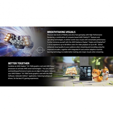 Видеокарта Sapphire AMD Radeon RX 7600 XT PULSE OC на базе архитектуры AMD RDNA 3, оснащенная 32 мощными улучшенными вычислительными блоками, кэш-памятью AMD Infinity Cache и выделенной памятью GDDR6 объемом 8 ГБ, обеспечивает сверхвысокую частоту кадров и великолепные ощущения при игре с разрешением 7680?4320.