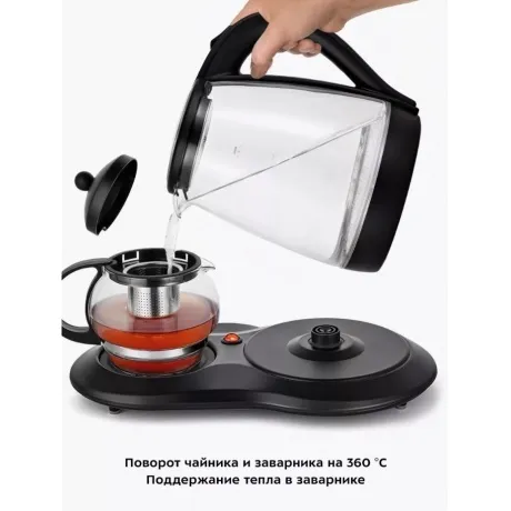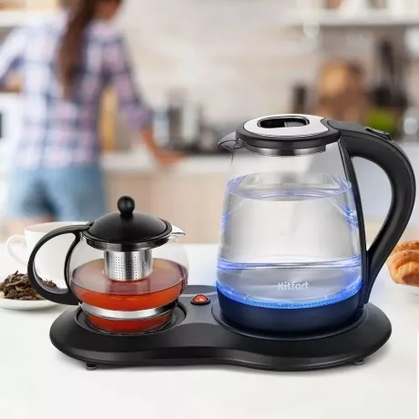 Стильный и функциональный чайный набор Kitfort КТ-6178 состоит из чайника ёмкостью 2 л, кувшина с фильтром для заварки ёмкостью 1 л и базы. Набор поможет вам не только вскипятить воду, но и заварить чай или кофе за пару движений! Кувшин для заварки изготовлен из термостойкого стекла и имеет съёмный фильтр для чая или кофе. В месте установки кувшина на базу присутствует скрытый нагревательный элемент с функцией поддержания тепла. Корпус чайника выполнен из стекла с вставкой из пластика. Нагревающий элемент встроен в дно чайника под нержавеющей пластиной. Мерная шкала находится на боковой стороне стеклянной части корпуса. На базе расположена кнопка включения поддержания тепла, а сама база изготовлена из пластика. На базе компактно располагается чайник и кувшин. Центральный контакт для чайника даёт возможность ставить чайник в любом положении, обеспечивая вращение на 360°.