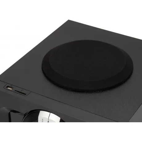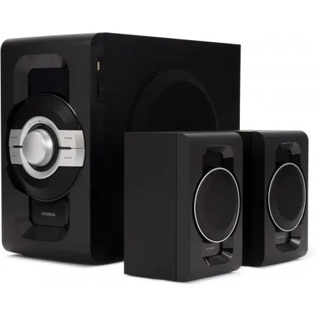 Музыкальный центр Mini Hyundai Hyundai H-MS1403, черный состоит из сабвуфера и двух колонок (система 2.1), выдает мощностью до 120 Вт (на пике). Соединение с источником звука производится беспроводным способом по Bluetooth 5.0. Возможно и подключение по кабелю, для чего предусмотрен разъем AUX. Кроме того, встроены слот для карт microSD и порт USB — можно воспроизводить треки с внешних накопителей. Поддерживается распространенный формат MP3. Интегрирован тюнер, принимающий сигналы FM-радиостанций. В сателлиты установлены 3-дюймовые динамики, в сабвуфер — 6,5-дюймовый. Управлять системой можно с панели на корпусе сабвуфера или при помощи дистанционного пульта, который поставляется в комплекте. Можно регулировать громкость, переключать треки, менять источник сигнала и прочее. Для наглядности над панелью расположен дисплей.