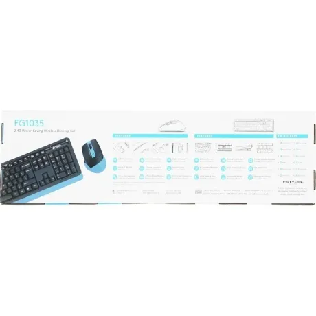 Клавиатура+мышь беспроводная A4Tech Fstyler FG1035 ? удобный рабочий комплект с подключением через USB-ресивер. Он подключает одновременно и мышь, и клавиатуру. Стабильная и надежная связь с ПК сохраняется на расстоянии 15 м. Клавиатура содержит 104 закругленные клавиши. Для быстрого доступа к интернет-функциям и мультимедийным можно воспользоваться комбинацией кнопок «FN + F1-F12». Особенность клавиатуре в защите от влаги, что позволяет не бояться случайного попадания капель воды на клавиши.[BR]Мышь из комплекта A4Tech Fstyler FG1035 оснащена светодиодным датчиком. Благодаря его разрешению 2000 dpi все движения мыши максимально точны и находят отображение на мониторе. На корпусе мыши находится кнопка смены dpi для настройки в соответствии с работой. При помощи ПО на боковые кнопки настраиваются функции «Вперед» и «Назад». Всего предусмотрено 6 кнопок.