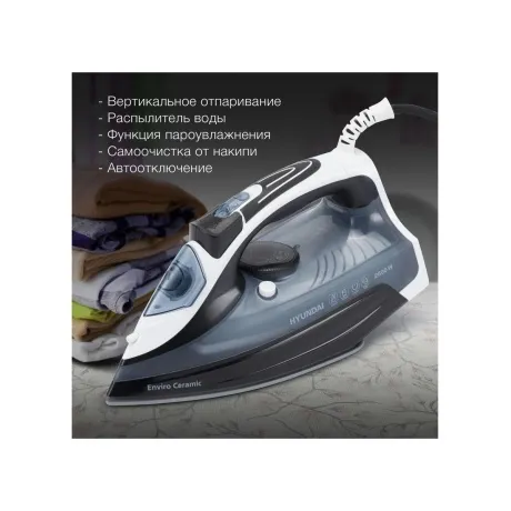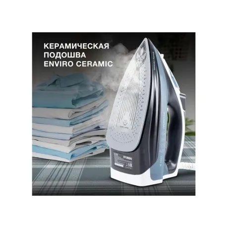 Hyundai H-SI01573 – это утюг с нагревательной поверхностью, бережно относящейся к любой одежде. Часть прибора, которая соприкасается с вещами, изготовлена из керамики, а именно, материала Enviro Ceramic. Сейчас он считается одним из самых высокотехнологичных на рынке подобных устройств. Максимальная мощность утюга - 2600 Вт - для удобства настройки распределена между четырьмя температурными режимами. Оптимальный можно подобрать даже для самой требовательной ткани. Если складки не поддаются, Hyundai H-SI01573 оснащён ёмкостью для воды. Она вмещает до 300 мл жидкости и служит как для разбрызгивания, так и для отпаривания. Обработка паром может происходить в горизонтальной и вертикальной ориентациях. Плюс, для особенно сложных мест в утюге предусмотрен «паровой удар» — это единовременный быстрый выброс пара, обеспечивающий повышенную силу воздействия на складки. Особенно это актуально для мягкой ткани. Кроме того, Hyundai H-SI01573 поддерживает функцию пароувлажнения. Прибор может автоматически отключаться при длительном бездействии, а также имеет противокапельную систему. С ней на месте, где стоял утюг, не останется ни следа. Шнур Hyundai H-SI01573 имеет длину 2 м и не сковывает движения при глажке. Он крепится к корпусу при помощи шарнирного механизма, снижающего вероятность перекручивания провода и его преждевременного выхода из строя.