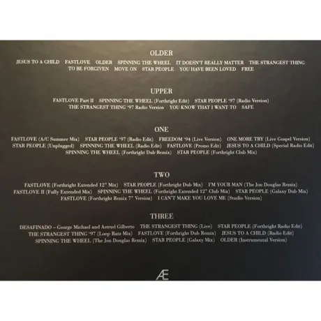 Older, Spinning The Wheel, It Doesnt Really Matter, The Strangest Thing, To Be Forgiven, Move On, Star People, You Have Been Loved, Free, Fastlove Part II, Spinning The Wheel (Forthright Edit), Star People ‘97 (Radio Version), The Strangest Thing ’97 (Radio Version), You Know That I Want To, Safe, Jesus To A Child, Fastlove, Older, Spinning The Wheel, It Doesnt Really Matter, The Strangest Thing, To Be Forgiven, Move On, Star People, You Have Been Loved, Free, Fastlove Part II, Spinning The Whee