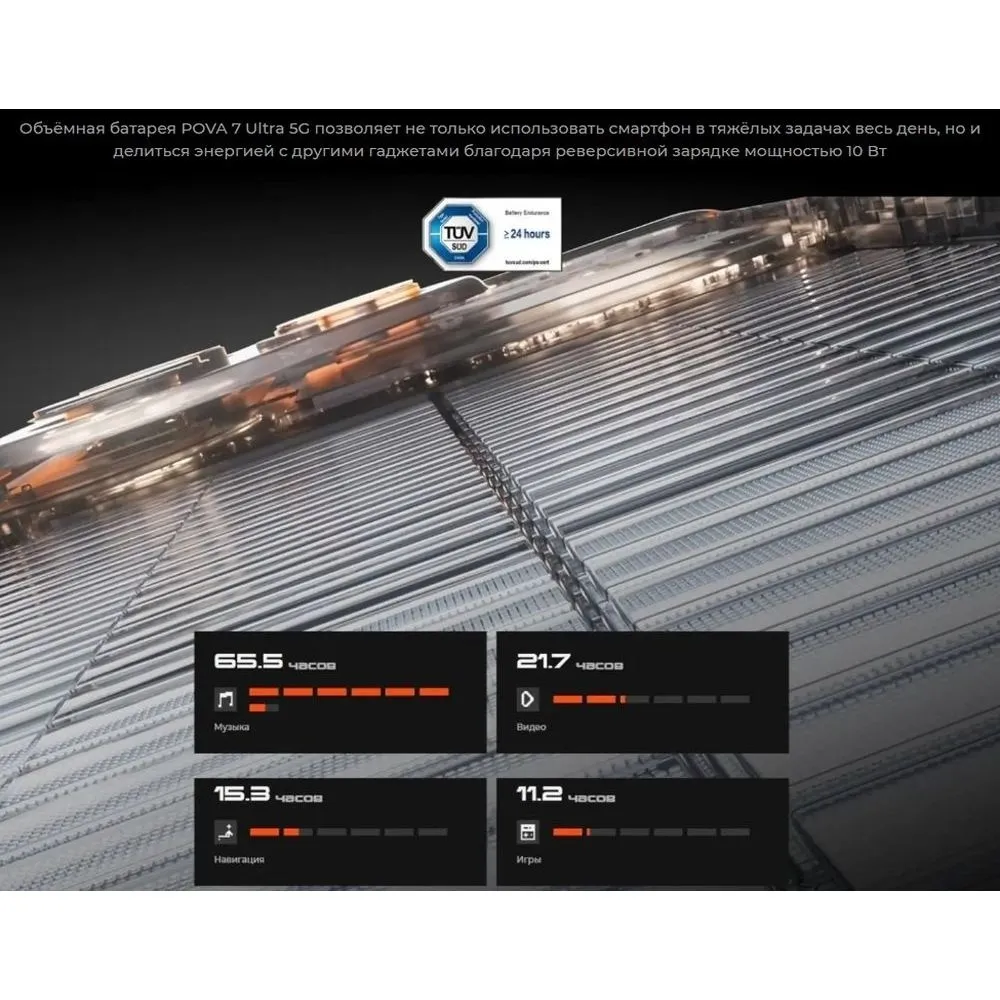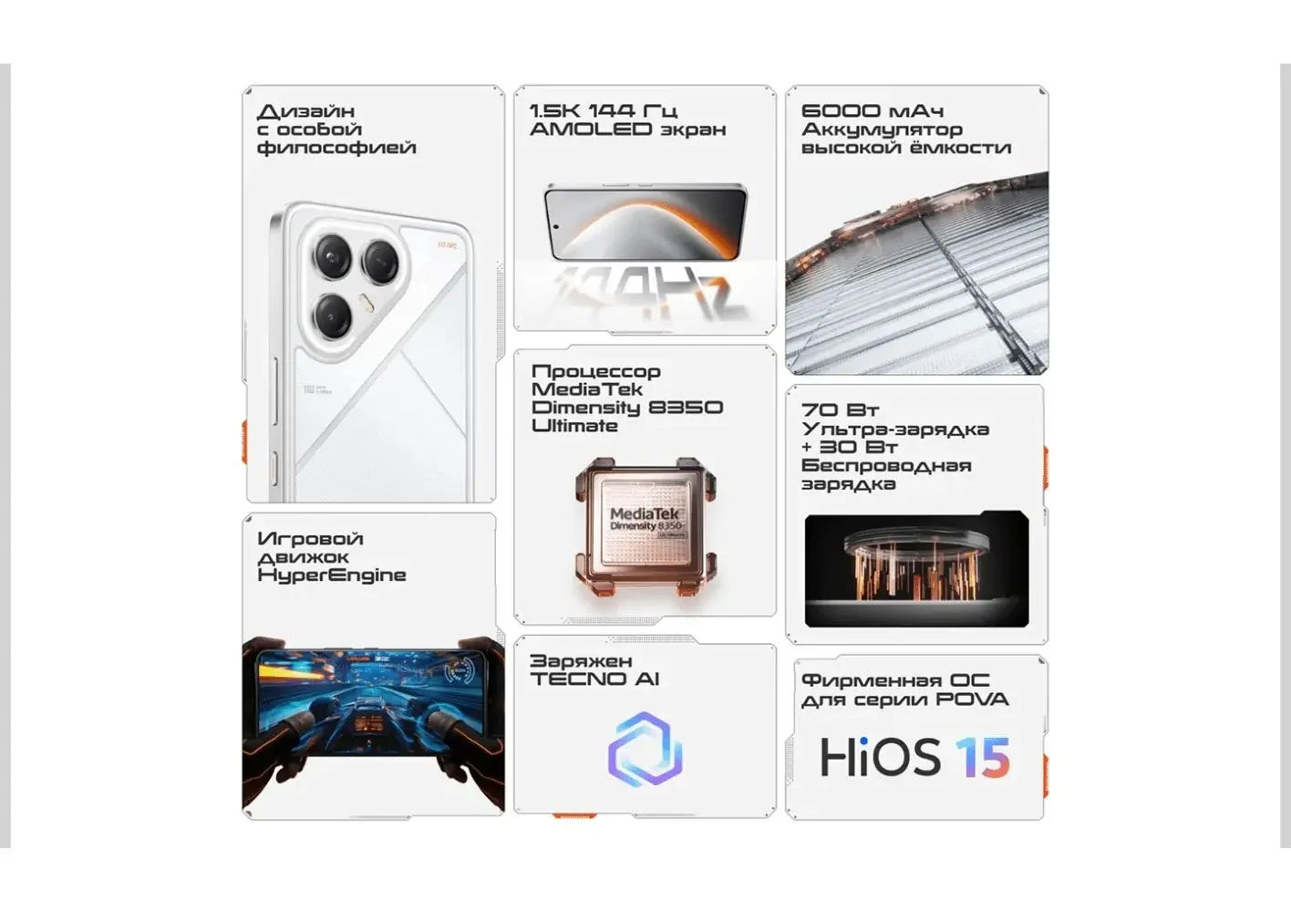 Флагманский смартфон со встроенным искусственным интеллектом TECNO AI и большими возможностями для мобильного гейминга. Умный ассистент Ella с поддержкой русского языка выполняет задачи любой сложности — от обработки фото до вызова такси. В Tecno POVA 7 Ultra 5G также встроены другие функции, реализуемые с помощью искусственного интеллекта TECNO AI: генерация текстов, решение задач, перевод разговоров в реальном времени, расшифровка аудио. Tecno POVA 7 Ultra 5G получил мощный чипсет MediaTek Dimensity 8350 Ultimate, который обеспечивает не только высокую производительность, но и улучшенное качество сотовой связи. Смартфон имеет 256 Гб постоянной памяти и 12 Гб оперативной с возможностью виртуального расширения вдвое. Игровой движок HyperEngine увеличивает скорость реакции во время мобильного гейминга на 24% по сравнению с предыдущим поколением. А 12-слойное охлаждение с 3D-испарительной камерой исключает перегрев смартфона. Впервые в смартфоне TECNO применена технология трассировки лучей для детализации графики некоторых игр. Большая ёмкость аккумулятора 6 000 мАч поддерживает работу смартфона в течение всего дня и даже больше. Быстро пополнить заряд поможет беспроводная 30 Вт или комплектная ультра-зарядка 70 Вт. Tecno POVA 7 Ultra 5G может делиться энергией с другими устройствами благодаря реверсивной зарядке 10 Вт, что превращает смартфон в пауэрбанк. Яркий AMOLED-экран диагональю 6.67? с высоким разрешением 1.5K и частотой 144 Гц передаёт сочные цвета и обеспечивает невероятно плавную картинку. Дисплей защищён закалённым стеклом Corning Gorilla Glass 7i. А стереодинамики с поддержкой Dolby Atmos создают эффект погружения в просматриваемый контент. Общайтесь на расстоянии до 1 километра даже тогда, когда нет связи с помощью FreeLink. Приложение в смартфоне Tecno POVA 7 Ultra 5G поддерживает звонки и сообщения по Bluetooth в отсутствие сигнала мобильной сети. А алгоритм PinPoint Nav 2.0 помогает точно определять геолокацию в городе и на открытых пространствах. Технологичный дизайн сочетает простоту и практичность. Под прозрачной панелью — объёмные детали, а в меню — уникальный шрифт и более 300 стилизованных значков приложений. Треугольный блок камер обрамлён светодиодным сигнальным глифом, который отображает уведомления, игровые действия, звонки и многое другое.