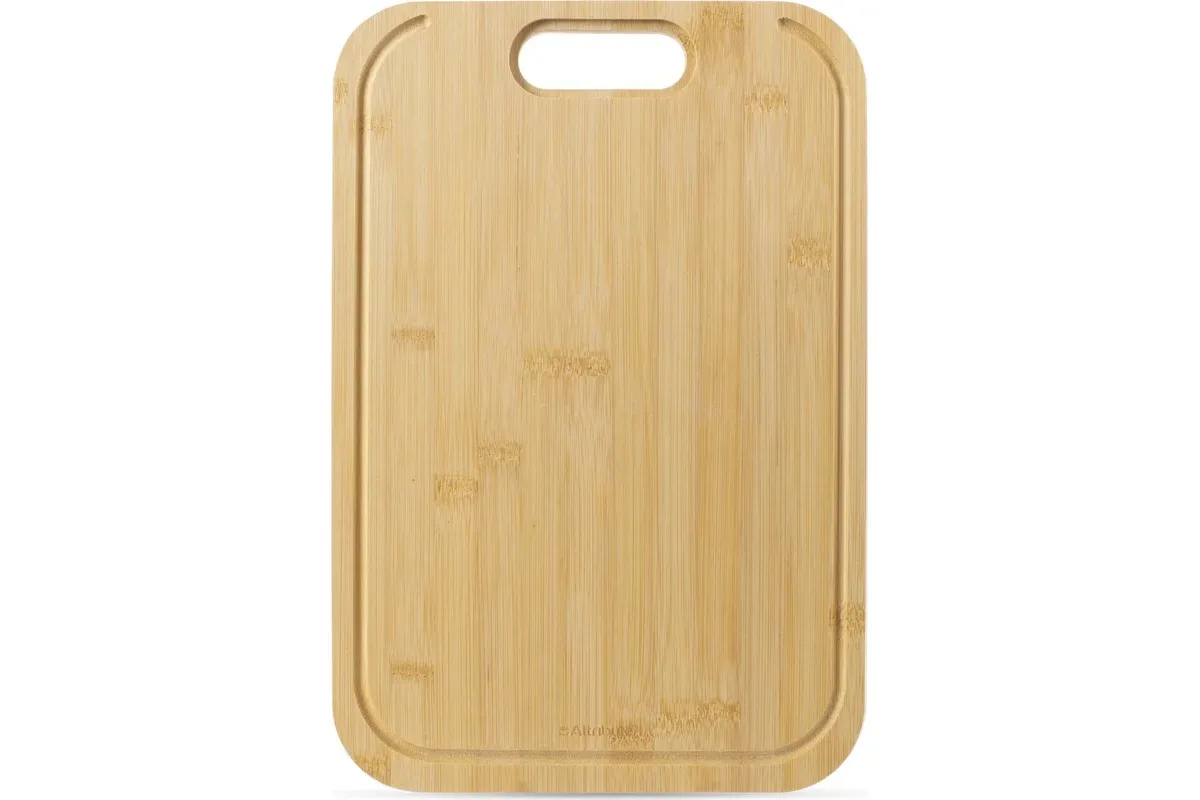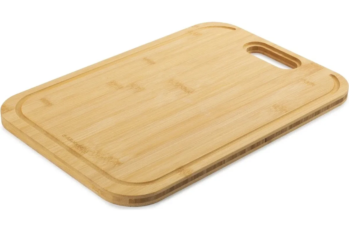 Разделочная доска должны быть на каждой современной кухне. Вы можете выбрать подходящий размер такого аксессуара для кухни или приобрести доски разных размеров. Разный размер досок помогает шинковать и резать отдельные группы продуктов, соблюдать гигиену при использовании сырых и вареных продуктов. Разделочная доска из бамбука отлично подходит для нарезки самых разных продуктов. Это могут быть сырое мясо, рыба, овощи, готовая пища. Кроме того, подобные изделия из бамбука можно считать многофункциональными, так как на них можно без опасения ставить горячие кастрюли, сковороды и использовать их в качестве подставки. Стоит отметить, что такой кухонный аксессуар из бамбука совершенно не боится перепада температур. Разделочной доской из бамбука очень удобно пользоваться, она легкая, гладкая, долговечная. Доска может стать украшением интерьера кухни, а не только практичным аксессуаром. Благодаря тому, что это довольно-таки прочный и износостойкий материал, такая доска длительное время не утратит свой первоначальный вид. Бамбуковая посуда прекрасно подойдет для подачи различных блюд и в качестве сервировочной сырной доски для вина, закусок, пиццы, канапе, суши и роллов, мяса, сыра, стейка, шашлыка, фруктов или овощей, а также может быть использована в качестве подставки для горячего, столика-подноса для завтрака в постель. Поверхность нашего кухонного аксессуара оснащена неглубоким желобком по краям.