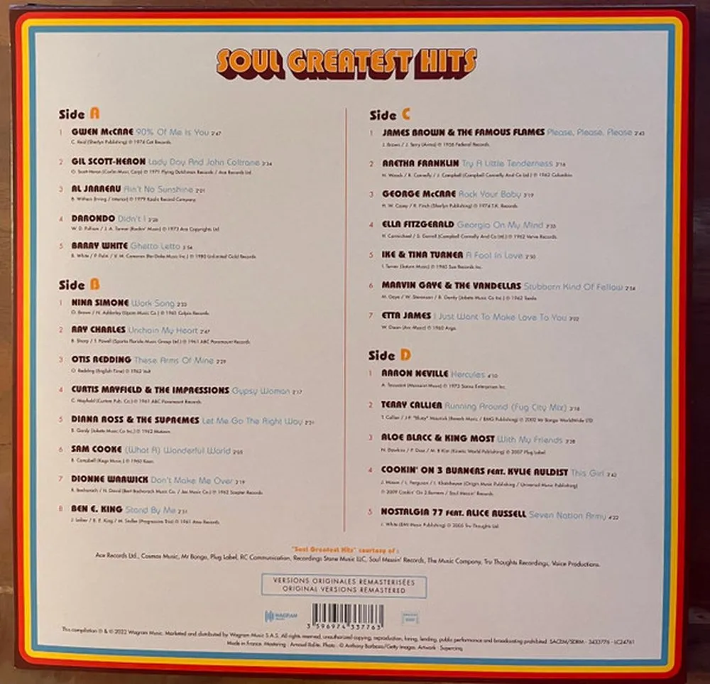 Главные хиты соула на двойном виниле. Среди артистов Арета Франклин, Рэй Чарльз, Нина Симон, Кертис Мэйфилд, Барри Уайт и многие другие.