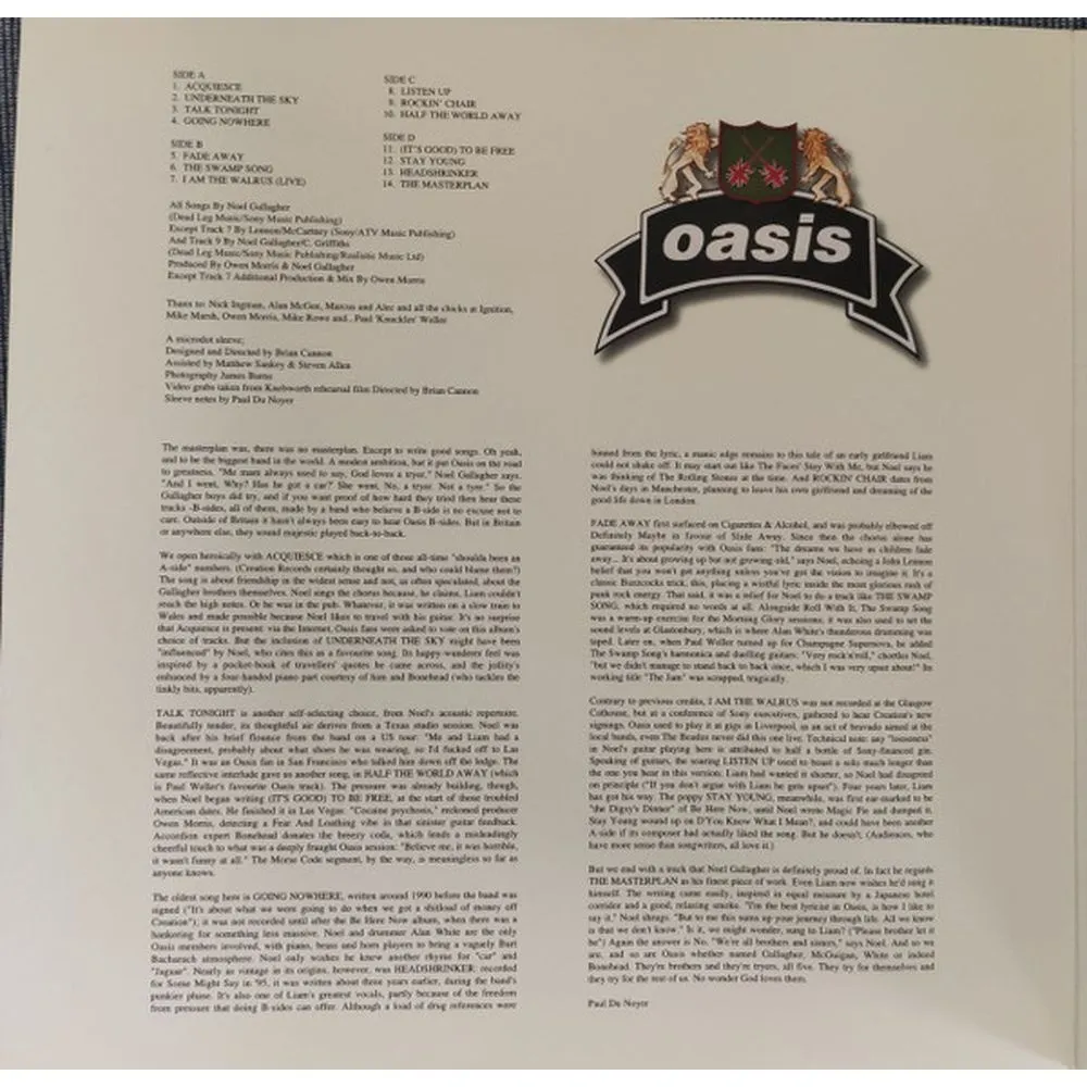 Двойной виниловый LP серебристого цвета. Цифровой ремастеринг. «The Masterplan» — сборник Oasis, первоначально выпущенный в 1998 году. Он включает в себя би-сайды, которые до этого не были включены в альбом. Изначально предназначавшийся для выпуска только в таких странах, как США и Япония, где эти треки ранее были доступны только на дорогих европейских синглах, «The Masterplan» достиг 2-го места в Великобритании, где он изначально стал платиновым, и 51-го места в США.