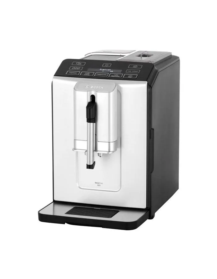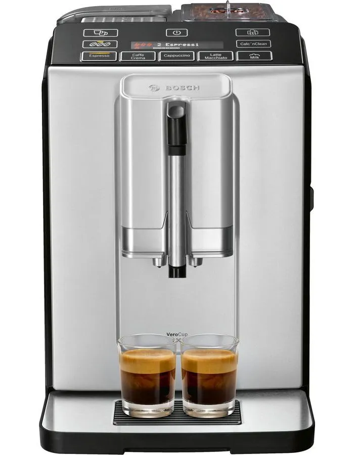 Прибор для приготовления горячих напитков: ристретто, эспрессо, кафе крема, эспрессо макиато, капучино, латте макиато, кафе латте, молочная пенка, теплое молоко, горячая вода. Регулировка степени помола, емкость контейнера для зерен 250 г. Одновременное приготовление двух чашек. Дисплей с подсветкой.