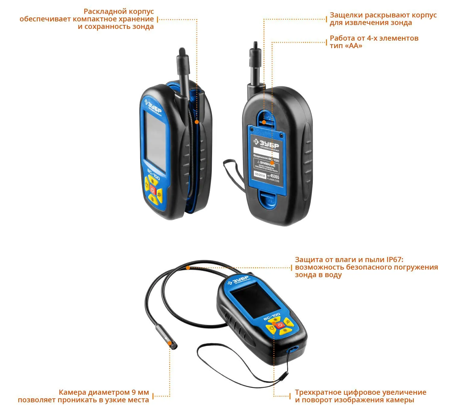 Видеоскопы ЗУБР позволяют быстро и качественно произвести осмотр систем отопления, вентиляции и кондиционирования, проверить элементы находящиеся в труднодоступных местах автомобилей и другой техники, не прибегая к частичному или полному ее демонтажу. Степень защиты IP67 позволяет использовать щуп прибора для диагностики систем водоснабжения. Низкое энергопотребление обеспечивает до 3 часов работы от одного комплекта батарей. Главный рабочий элемент видеоскопа – измерительный наконечник на зонде. Именно с помощью него осуществляется осмотр скрытых от глаз пользователей участков. Изображение передается на находящийся на корпусе ЖК-дисплей.