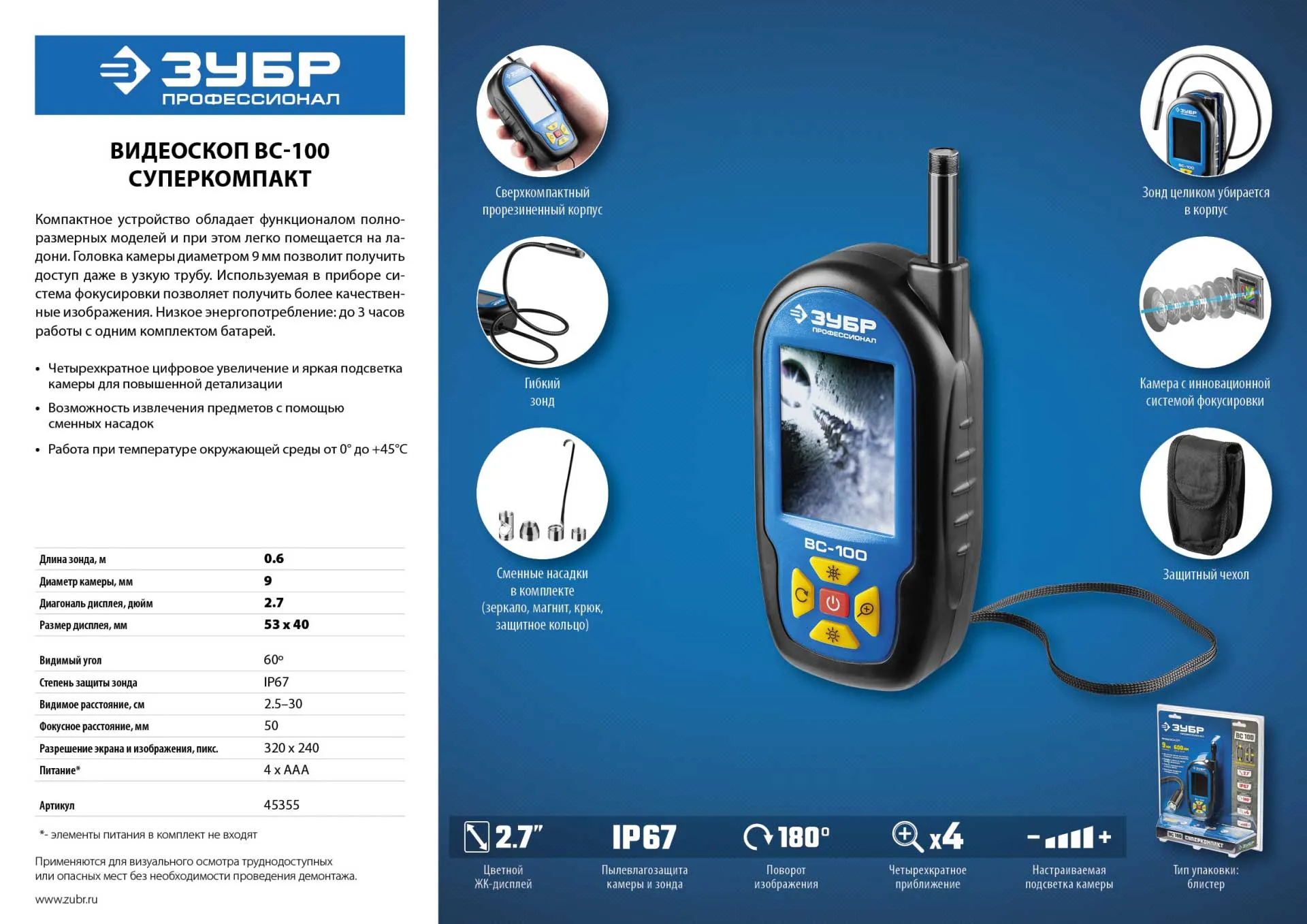 Описание товара Видеоскоп Зубр Профессионал ВС-100 (45355)