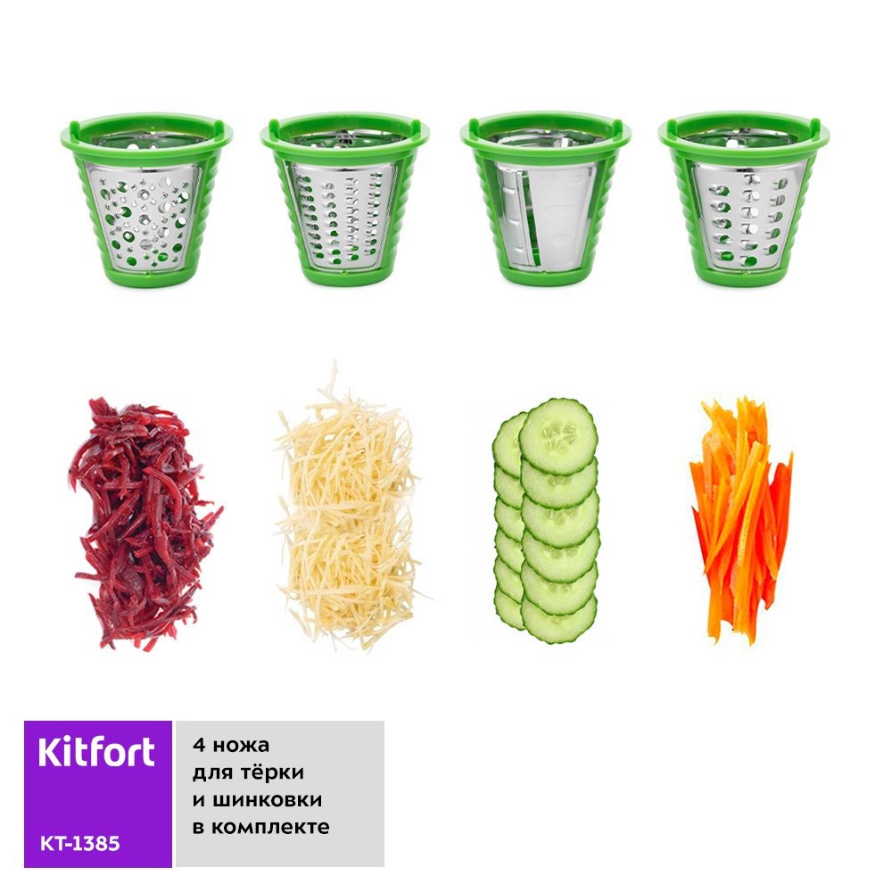 Мультирезка Kitfort КТ-1385 справится с приготовлением салатов, овощных рагу и многих других блюд. Она укомплектована четырьмя насадками: тремя терками с отверстиями разного диаметра и ножом для шинковки.ПРАКТИЧНАЯ КОНСТРУКЦИЯПосле окончания готовки вы можете отмыть устройство за пару минут — оно быстро разбирается на части.ПРОСТО И БЕЗОПАСНОНажмите и удерживайте кнопку, чтобы запустить мультирезку — она способна проработать до 10 минут без остановки. Длинный нескользящий толкатель защитит ваши пальцы от контакта с лезвиями.