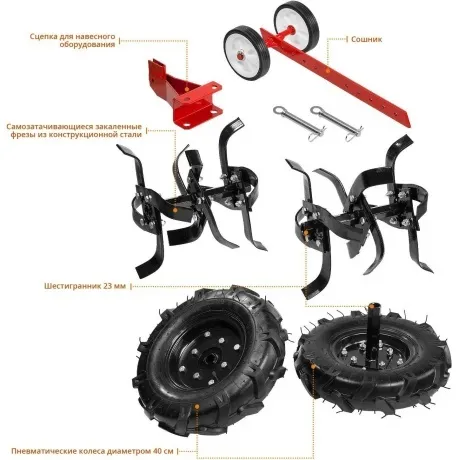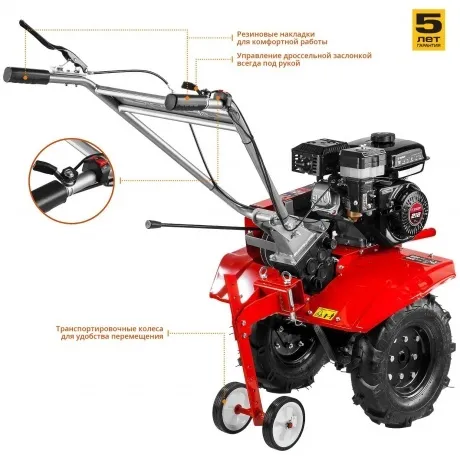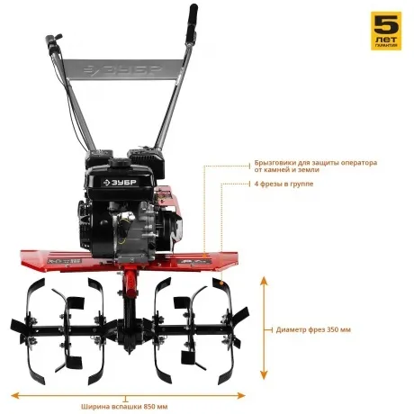 Мотоблок ЗУБР МТБ-400, предназначен для рыхления и культивирования, а при использовании дополнительного навесного оборудования спектр применения мотоблока значительно расширится. Кронштейн для крепления навесного оборудования и шкив отбора мощности позволяют использовать широкую гамму навесного оборудования: снегоуборщик, щетку, роторную косилку. 3 скорости вперед (понижающая, основная и повышающая) и 1 назад позволяют комфортно работать на любых типах почвы. Чугунный шестеренчато-цепной редуктор с закаленной шестигранной осью 23 мм. Cамозатачивающиеся закаленные фрезы из конструкционной стали. Универсальная сцепка позволяет использовать различное навесное оборудование. Закаленные фрезы прекрасно закапываются на полную глубину и способствуют продвижению мотоблока вперед. Конструкция мотоблока позволяет использовать его с различными навесными оборудованием. Большие пневматические колеса обеспечивают отличную проходимость.