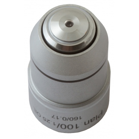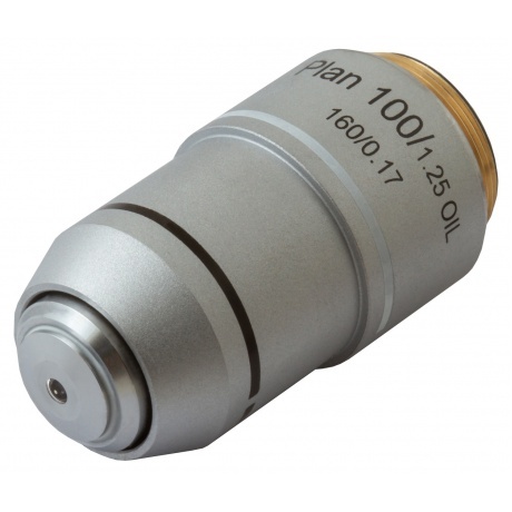 Материал линз: оптическое стекло / Материал корпуса: медь / Оптическая конструкция: планахромат / Увеличение, крат: 100 / Апертура: 1,25 / Рабочее расстояние, мм: 0,234 / Парфокальное расстояние, мм: 195 / Толщина совместимого покровного стекла, мм: 0,17 / Длина совместимого тубуса, мм: 160 / Тип резьбы: WJ 4/5*1/36 / Пружинящая оправа: есть / Масляная иммерсия: есть.