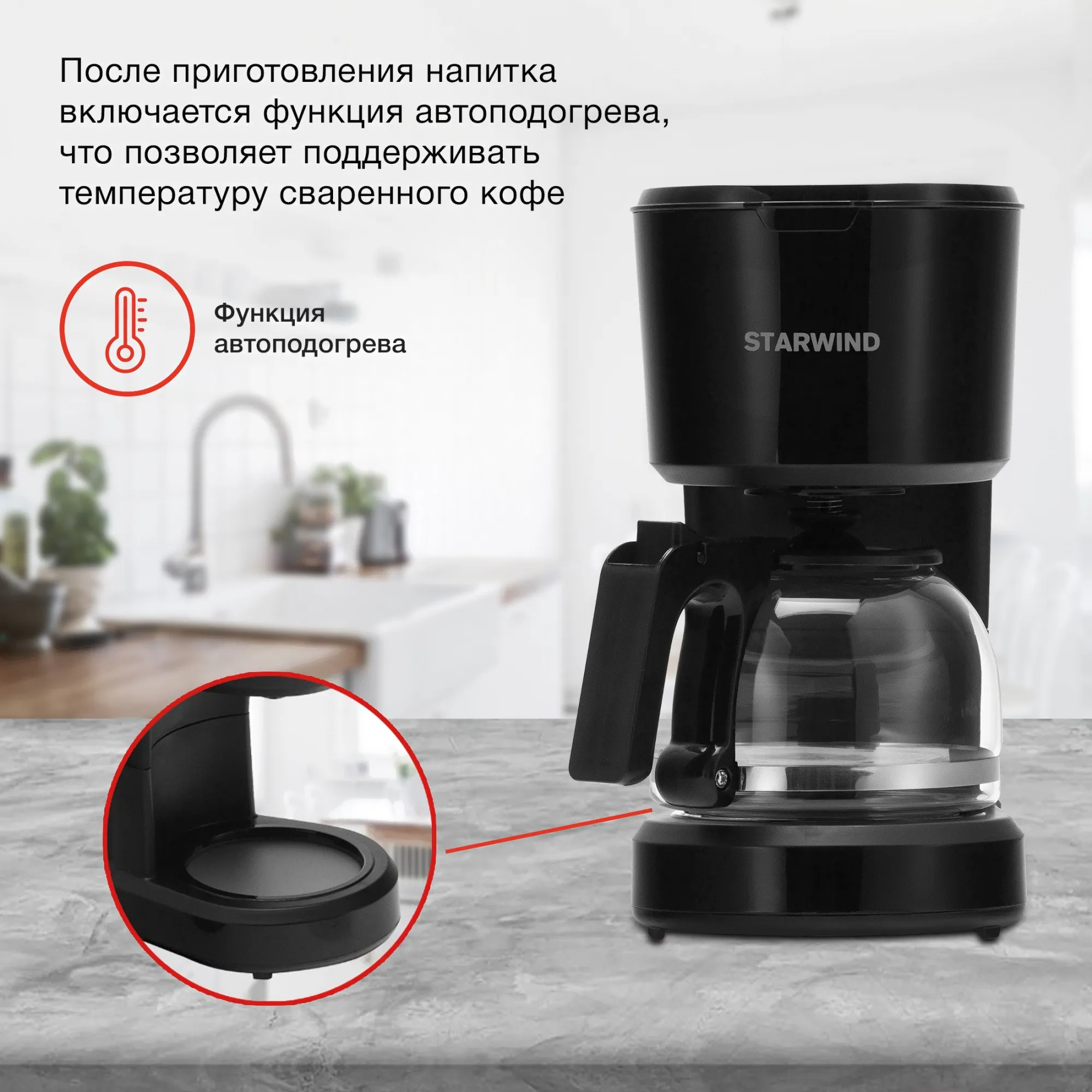 Starwind STD0610 оснащена плитой автоподогрева, которая не допускает остывание напитка. Доступ к функционалу открывается с помощью кнопочной панели управления. Для подключения к сети предусмотрен 0.7-метровый кабель. Прорезиненные ножки гарантируют устойчивое размещение модели на любой поверхности.