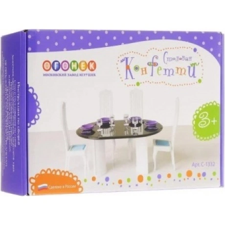 Набор мебели для кукол Огонек Столовая Конфетти понравится вашей малышке и дополнит ее кукольный домик., При помощи набора Столовая Конфетти ваша дочурка может обустроить в кукольном домике замечательную столовую для своих любимых кукол. Предметы мебели выполнены в спокойных тонах. Мебель складывается по специальной схеме, которая также есть в комплекте., Столовая состоит из стульев и большого стола, а также из набора посуды. При помощи такой мебели, ваш ребенок может наглядно увидеть каким образом должны быть устроены разные помещения, формируя нормальное понимание окружающего мира., Все элементы столовой выполнены из качественных и безопасных материалов.