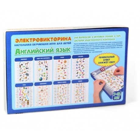 Детям начинать изучать английский язык намного проще, если процесс обучения построен в виде викторины. Именно для этого разработана настольная обучающая игра – электровикторина «Английский язык». 240 вопросов-заданий на 8 игровых полях с наглядным материалом. Самые значимые темы: животные, противоположности, еда, цвета, время, части тела, глаголы, а также задания «Кто есть кто» с описанием по картинке..