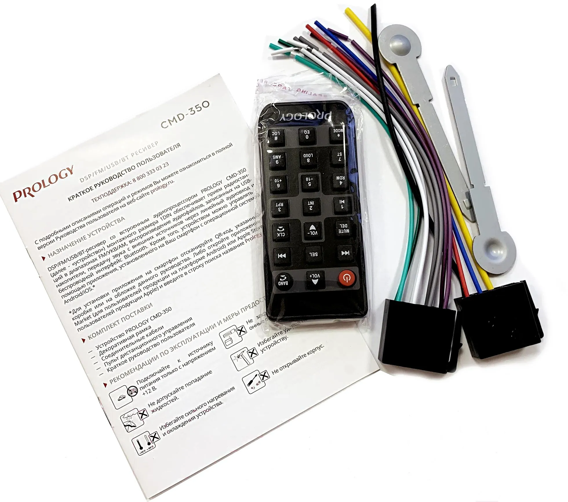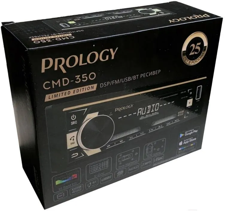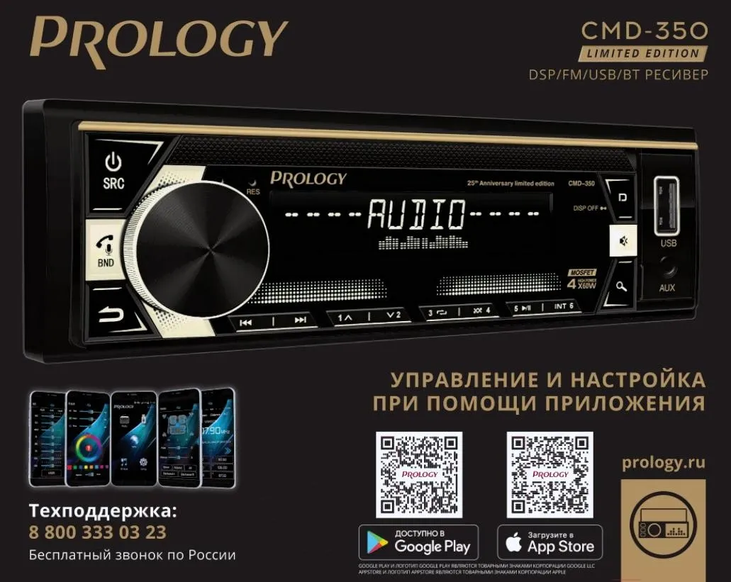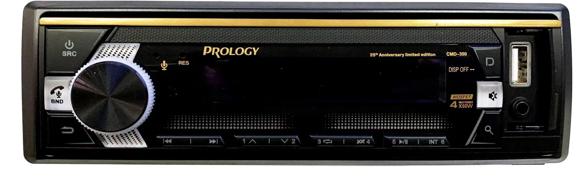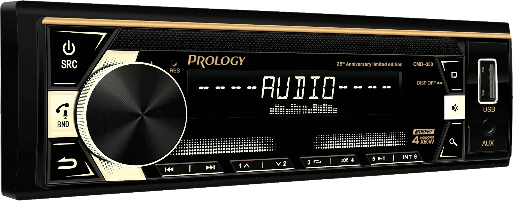 PROLOGY CMD-350 — FM / USB ресивер с Bluetooth и встроенным DSP - аудиопроцессором, стандартного размера 1DIN, который обеспечивает прием радиостанций в диапазоне FM / УКВ / AM и воспроизведение медиафайлов MP3, WAV, и FLAC форматов, записанных на USB накопители, передачу звука с внешних источников через линейный аудиовход и беспроводной интерфейс Bluetooth. Поддерживается управление мобильным телефоном через интерфейс Bluetooth (ver. 4, 2). Максимальная выходная мощность 4x60 Вт (MOSFET), поддержка акустики 4 или 8 Ом. Четырехмостовые MOSFET-усилители мощности TDA7851A разработаны для мощных автомобильных автомагнитол и радиоприемников. Полностью комплементарная выходная структура P-канал/N-канал четырехмостовых усилителей мощности TDA7851A обеспечивает размах выходного напряжения от шины до шины. TDA7851A устанавливают новые эталоны мощности в области автомобильных звуковоспроизводящих устройств (автомагнитол и радиоприемников) с беспрецедентными характеристиками искажений.