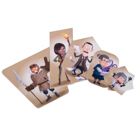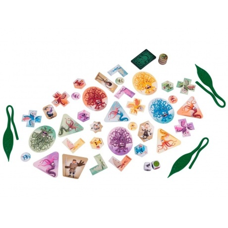 8 липких щупалец, 30 жетонов глубоководных, 30 жетонов существ, 5 жетонов сыщиков, 12 карт проклятий, 1 кубик существа, 1 кубик цвета, Правила
