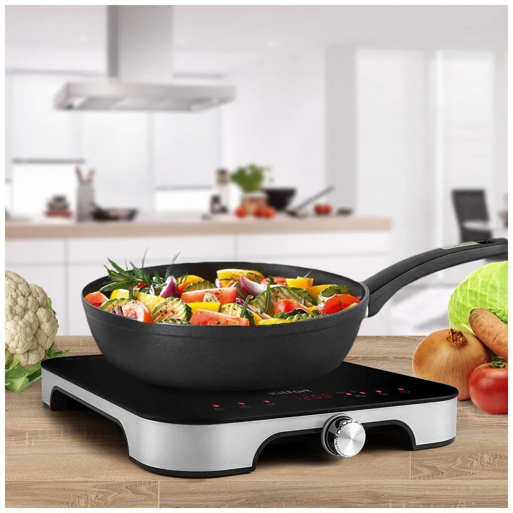 Плита Kitfort KT-148 на основе индукционной технологии обеспечивает качественное и комфортное приготовление блюд. Стеклокерамическая панель отличается стойкостью к повреждениям и простотой в уходе. Данная модель оснащена функцией ускоренного нагрева, таймером до 24 часов и возможностью регулировки температуры. Поворотный регулятор позволяет плавно регулировать мощность нагрева. Также на панели расположены сенсорные кнопки для легкости выбора параметров прикосновениями. С боковых сторон корпуса предусмотрены ручки для простого перемещения прибора. Ножки на основании предотвращают скольжение Kitfort KT-148 на столешнице.
