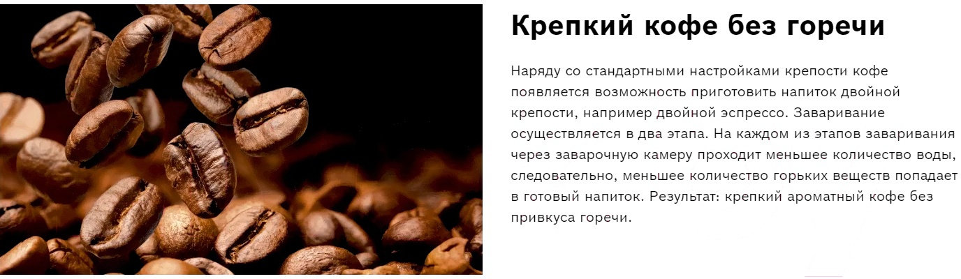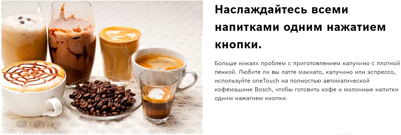 Кофемашина Vero Barista Bosch TIS65429RW Крепкий кофе без горечи Наряду со стандартными настройками крепости кофе появляется возможность приготовить напиток двойной крепости, например двойной эспрессо. Заваривание осуществляется в два этапа. На каждом из этапов заваривания через заварочную камеру проходит меньшее количество воды, следовательно, меньшее количество горьких веществ. Интеллектуальная система нагрева воды: полное извлечение аромата кофейных зерен благодаря SensoFlow Интеллектуальная система нагрева воды с сенсорами температуры доводит воду до оптимальной температуры 90°C - 95°C за рекордно короткое время и поддерживает ее неизменной в течение всего процесса заваривания. Одно нажатие кнопки - две чашки кофе С системой Bosch OneTouch DoubleCup кофейно-молочные напитки теперь готовятся еще быстрее и удобнее. Все напитки могут быть приготовлены сразу для двух чашек одновременно. Больше не нужно ждать, готовьте ваш любимый кофе для двоих. Наслаждайтесь всеми напитками одним нажатием кнопки Больше никакх проблем с приготовлением капучино с плотной пенкой. Любите ли вы латте макиато, капучино или эспрессо, используйте OneTouch на полностью автоматической кофемашине Bosch, чтобы готовить кофе и молочные напитки одним нажатием. Автоматическая очистка молочной системы для идеальной гигиены Попрощайтесь с хлопотами по очистке молочной системы каждый день. AutoMilk Clean полностью автоматически очищает систему паром, поддерживая ее в чистоте и гигиеничности. Тщательная очистка молочной системы после каждого приготовления напитка. Керамическая мельница Кофемолка с жерновами из высококачественной керамики работает практически бесшумно и обеспечивает качественный помол кофейных зерен. Дополнительная изоляция отсека не только снижает уровень шума работающей кофемолки, но и повышает ее герметичность, сохраняет аромат кофейных зерен. Давление- 15 бар Мощность- 1500 Вт Одновременное приготовление для 2-х чашек ? Возможность использования высоких стаканов ? Регулировка температуры напитка — Емкость для воды- 1.7 л Отсек для кофейных зерен- 300 г Отсек для молотого кофе ? Материал жерновов- Керамика Регулируемая степень помола- Многоступенчатая Система предварительного кипячения — Система предварительного перемалывания — Разборный капучинатор ? Съемный заварочный блок ? Съемный отсек для кофейной гущи ? Автоматического ополаскивание ? Автоматическое отключение дисплея- 30 мин Установка- Отдельностоящая Серия- Vero Barista 400 Защита от детей ? Home Connect — Цвет- Черный Страна производства- Словения Приготовление напитков: Эспрессо ? Эспрессо маккиато ? Американо ? Кофе ? Кофе с молоком ? Флэт уайт ? Капучино ? Латте маккиато ? Молочная пена ? Теплое молоко ? Горячая вода ? Избранное ? Персональные рецепты —