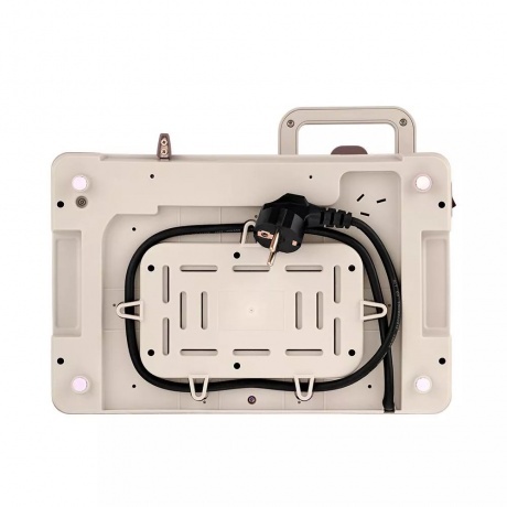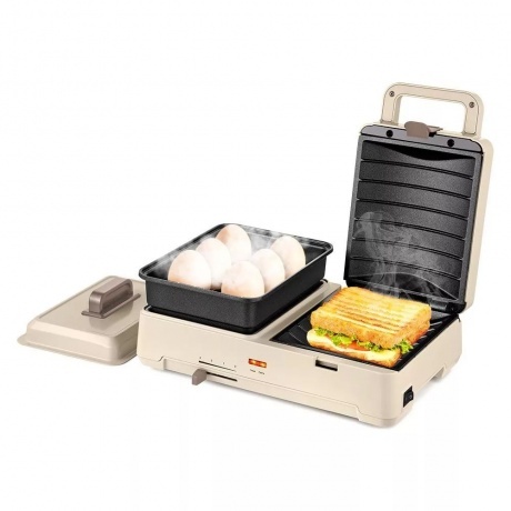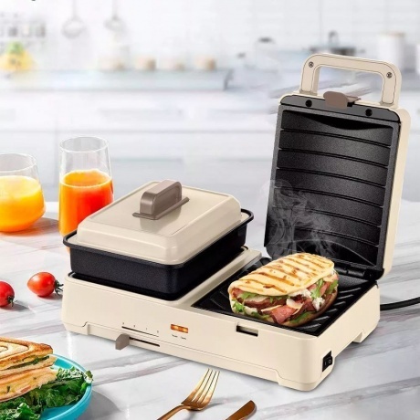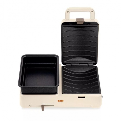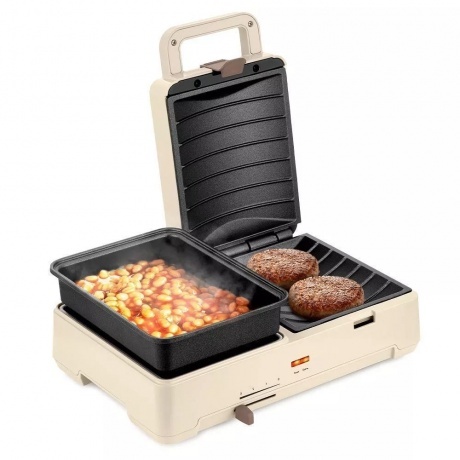 Бутербродница «2 1» совмещает себе функции устройств: электрической плиты бутербродницы. Слева располагается небольшая конфорка, справа бутербродница несъёмными панелями. Панели данном приборе изогнутые, поэтому при приготовлении сэндвичей начинка них не вытекает, края остаются чистыми. Антипригарное покрытие даёт возможность готовить минимальным количеством масла не позволяет блюдам прилипнуть панелям. Управление конфоркой осуществляется регулятором нагрева. Чтобы воспользоваться бутербродницей, необходимо включить переключатель питания сбоку прибора. На конфорке чаше вы можете отварить на пару овощи или яйца, используя решётку, также сварить кашу. бутерброднице можно легко поджарить бекон, сосиски, сделать сэндвичи, гренки бутерброды. Ручка бутербродницы не нагревается во время готовки. Зажим на ручке обеспечивает удобство приготовлении, хранении транспортировке. Благодаря компактному размеру стильному дизайну бутербродница отлично впишется интерьер небольшой кухни идеально подойдёт для приготовления еды на одного–двух человек. комплект входит небольшая чаша из нержавеющей стали крышкой решёткой. Многие детали съёмные, что облегчает очистку. На дне прибора есть держатель шнура питания, что обеспечивает удобное хранение устройства.