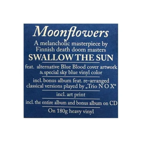 МЕЛАНХОЛИЧНЫЙ ШЕДЕВР ФИНСКИХ МАСТЕРОВ ДЭТ-ДУМ-МЕТАЛЛА SWALLOW THE SUN!. Лимитированное издание нового альбома Moonflowers в бокс-сете на тройном виниле небесно-голубого цвета + 2CD.. Moonflowers - это 52-х минутный опус из восьми песен, который глубоко проникает в сердце безутешной души главного автора песен Swallow The Sun Юхи Райвио. От драматического «Enemy» и мрачного «This House Has No Home» до нежных «Moonflowers Bloom in Misery» и прекрасной «The Fight of Your Life» - Moonflowers столь же продуктивный и динамичный, сколь заверщенный и интимный. В записи участвуют вокалистка Oceans of Slumber Cammie Gilbert, Антти Хююрюнен из группы Stam1na и Trio NOX, которые исполняют переработанную классическую версию «Moonflowers» в финской церкви, которая является бонусным альбомом к некоторым из форматам грядущего альбома - это еще один повод в высшей степени уважать последний прыжок Swallow the Sun в неизведанное. Moonflowers будет доступен в виде лимитированного делюкс-издания “Blue Blood Edition” на 3LP + 2CD в художественно оформленном бокс-сете (релиз состоится 14 января следующего года), в лимитированном медиабуке на двух компакт-дисках (выйдет 19 ноября 2021 года), и в гейтфолде на 2LP + CD (также 19 ноября).