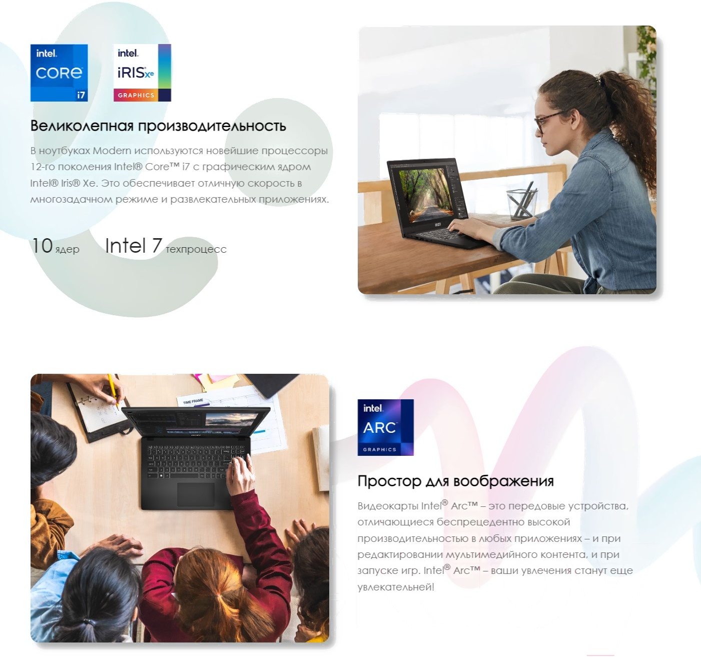 Ноутбуки MSI - это современные и производительные устройства, созданные в Китае. Они имеют стильный и элегантный дизайн, который придает им особую привлекательность. Серия Modern оснащена новейшими процессорами. Наслаждайтесь волшебными моментами творчества, которым всегда есть место в повседневной жизни. Эти ноутбуки легкие и портативные, что делает их идеальными для работы вне офиса или в поездках. Несмотря на компактные размеры, имеют внутри достаточно места для хранения и обработки данных. Оснащены яркими и четкими дисплеями, которые обеспечивают непревзойденное качество изображения и удовлетворяют самым требовательным пользователям. В целом, ноутбуки MSI - это идеальное сочетание стиля, мощности и портативности.