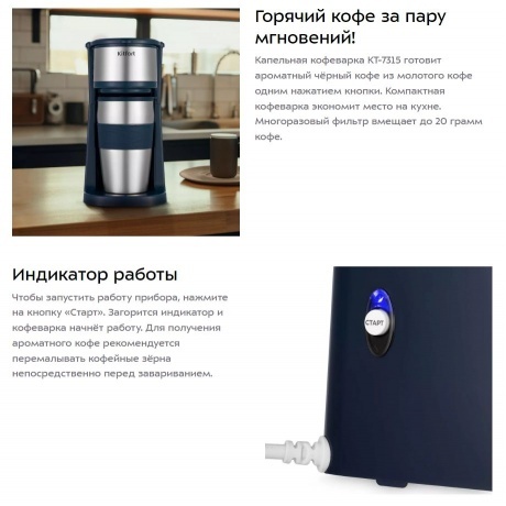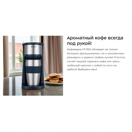 Капельная кофеварка КТ-7315 готовит ароматный чёрный кофе из молотого кофе одним нажатием кнопки. Компактная кофеварка экономит место на кухне. Многоразовый фильтр вмещает до 20 грамм кофе. Чтобы запустить работу прибора, нажмите на кнопку «Старт». Загорится индикатор и кофеварка начнёт работу. Для получения ароматного кофе рекомендуется перемалывать кофейные зёрна непосредственно перед завариванием. Термокружка выполнена из нержавеющей стали с силиконовой вставкой, которая не даст вам обжечься или выронить из рук термокружку. Крышка термокружки позволяет пить кофе на ходу, благодаря удобной форме отверстия для питья, которое можно закрывать. В кофеварке горячая вода медленно поступает в фильтр с молотым кофе. Многоразовым фильтром можно пользоваться любое количество раз. Сетка фильтра изготовлена из нейлона. Фильтр вмещает 20 грамм молотого кофе, а резервуар для воды имеет ёмкость 420 мл. Кофеварка КТ-7315 обладает не только большим функционалом, но и компактным размером и украсит любую кухню! Угостить гостей чашкой горячего кофе или взять любимый напиток с собой по пути на работуx Выбирать вам!