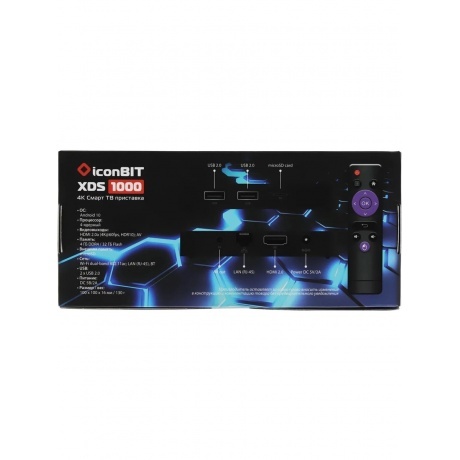 Медиаплеер iconBIT XDS1000 представляет собой универсальное решение для использования как дома, так и в офисе. Данная модель оснащена мощной начинкой, 4 ГБ оперативной и 32 ГБ постоянной памяти и может выводить изображение в разрешении вплоть до 4K. В основе используется ОС Android 10 с множеством различных приложений, предоставляющих доступ к фильмам, музыке, стримам, а также прямым трансляциям спортивных событий. Отличительной особенностью медиаплеера является возможность автовключения, автовоспроизведения, зацикливания и повтора записей. Помимо этого модель обладает простым и удобным интерфейсом, что вкупе с пультом ДУ делает использование особенно простым и удобным. Медиаплеер iconBIT XDS1000 выполнен в прочном и компактном корпусе. Для подключения к экрану может использоваться HDMI-выход, а также композитный выход AV. Также на корпусе есть несколько портов USB для подключения внешних носителей, порт Ethernet и слот для карт памяти. Подключение к сети Интернет также может осуществляться при помощи Wi-Fi. Для питания используется сеть 220 В.