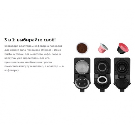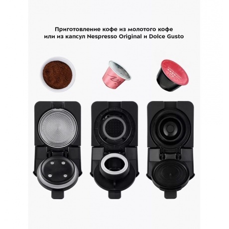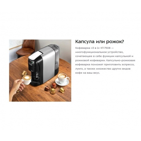 Кофеварка «3 в 1» КТ-7508 — многофункциональное устройство, сочетающее в себе функции капсульной и рожковой кофеварки. Капсульно-рожковая кофеварка поможет приготовить эспрессо, лунго, а также множество других видов кофе на ваш вкус. Благодаря адаптерам кофеварка подходит для капсул типа Nespresso Original и Dolce Gusto, а также для молотого кофе. Кофе в капсулах уже спрессован, для его приготовления необходимо просто поместить капсулу в адаптер, а адаптер — в кофеварку. Кнопка «Вкл/Выкл» включает и отключает нагрев кофеварки. Кнопка «Эспрессо» включает приготовление одной порции эспрессо. Кнопка «Лунго» включает приготовление лунго. Капсульные кофеварки позволяют сделать процесс приготовления кофе быстрым, простым и удобным. Кофе в капсулах уже спрессован, для его приготовления необходимо просто поместить капсулу в адаптер, а адаптер — в кофеварку. Резервуар для воды съёмный: его можно легко снять и наполнить водой. Ёмкость резервуара – 0.7 л. У кофеварки есть режим энергосбережения: при отсутствии нажатий на кнопки в течение 10 минут кофеварка отключается. При этом нагрев не осуществляется. Чтобы снова включить нагрев кофеварки, нужно нажать на кнопку «Вкл/Выкл». Поддон для сбора капель со съёмной решёткой легко снимается, моется и устанавливается обратно. Если у вас чашка выше, то вы можете убрать поддон и устанавливать чашку без поддона и решётки. Ценители кофе выбирают рожковые кофеварки, потому что им важно непосредственно участвовать в процессе приготовления кофе, создавать собственные рецепты. А для тех, кто спешит есть возможность использовать капсулы 2х типов. Наслаждайтесь вкусом и ароматом!