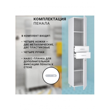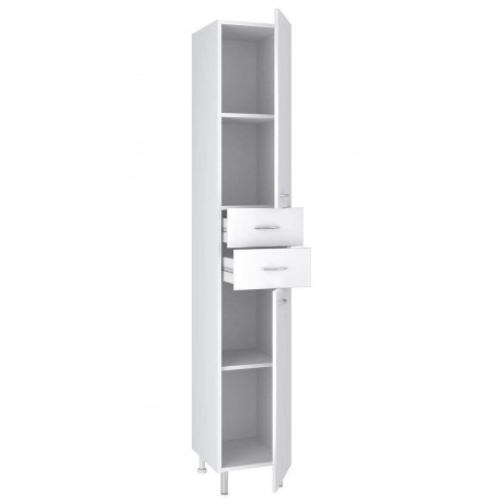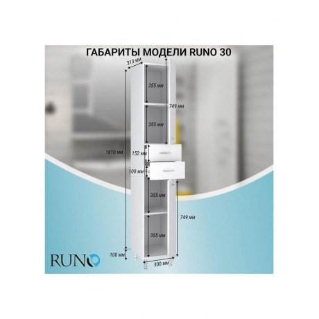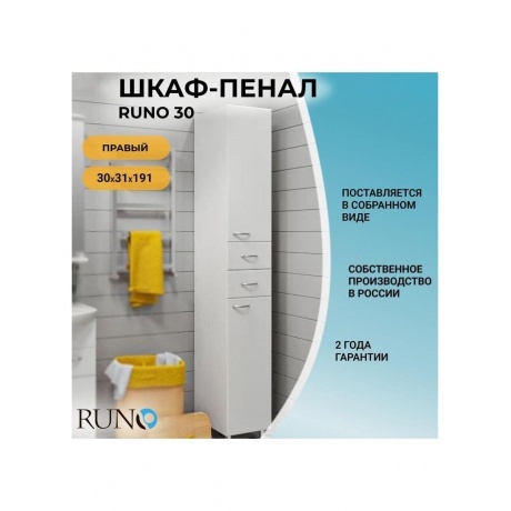 Пенал RUNO 30 правый 00000000125 - функциональное решение для недорогого и современного оснащения ванной комнаты. Шкаф выполнен в белом цвете, идеально впишется в любой интерьер ванной комнаты. Изделие имеет две распашные дверцы, в нижнем и верхнем отделениях по одной встроенной полке и два выдвижных ящика на шариковых направляющих. В комплекте идут петли со встроенным доводчиком, 4 ручки, 2 хромированные и 2 пластиковые ножки. Мебель для ванной RUNO - красота и практичность в мелочах!