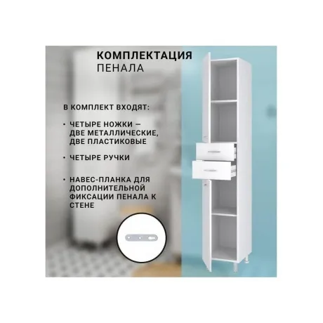 Пенал RUNO 40 - функциональное решение для недорогого и современного оснащения ванной комнаты. Шкаф выполнен в белом цвете, идеально впишется в любой интерьер ванной комнаты. Изделие имеет две распашные дверцы, в нижнем и верхнем отделениях по одной встроенной полке и два выдвижных ящика на шариковых направляющих. В комплекте идут петли со встроенным доводчиком, 4 ручки, 2 хромированные и 2 пластиковые ножки. Мебель для ванной RUNO - красота и практичность в мелочах!