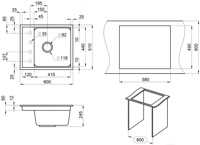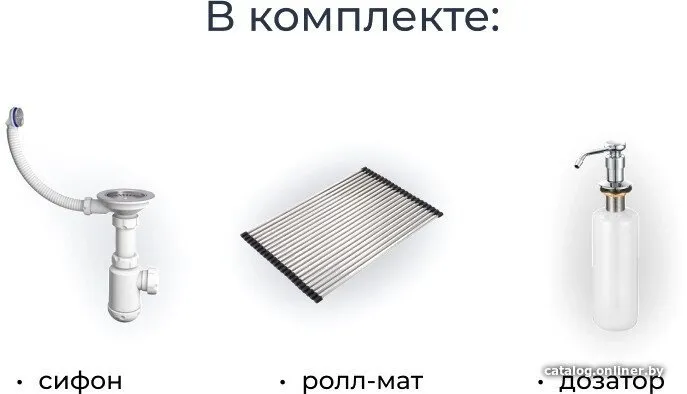 мойка кухонная, сифон с отводом для бытовой техники, комплект креплений, дозатор для жидкого мыла (нерж) и ролл-мат, инструкция, упаковка