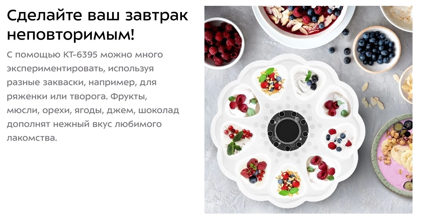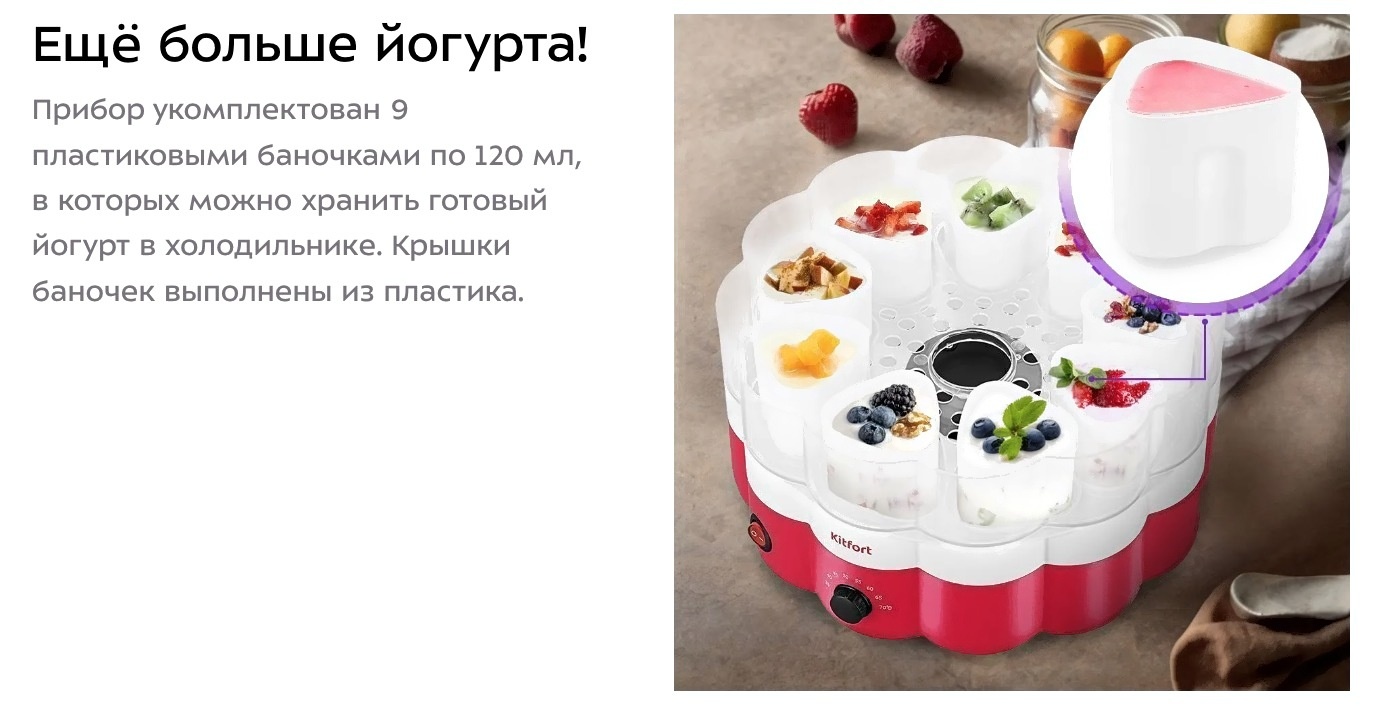 Йогуртница КТ-6395 предназначена для приготовления вкусного и полезного домашнего йогурта. Благодаря порционным баночкам, готовить, хранить и употреблять йогурт становится невероятно удобно и практично. Прибор укомплектован 9 пластиковыми баночками по 120 мл, в которых можно хранить готовый йогурт в холодильнике. Крышки баночек выполнены из пластика.