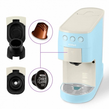 Капсульная кофемашина Kitfort КТ-7466 - Благодаря адаптерам кофеварка подходит для капсул типа Nespresso Original и Dolce Gusto, а также для молотого кофе. Она прекрасно совмещает в себе все преимущества каждого типа кофеварок и готовит под давлением 19 бар.