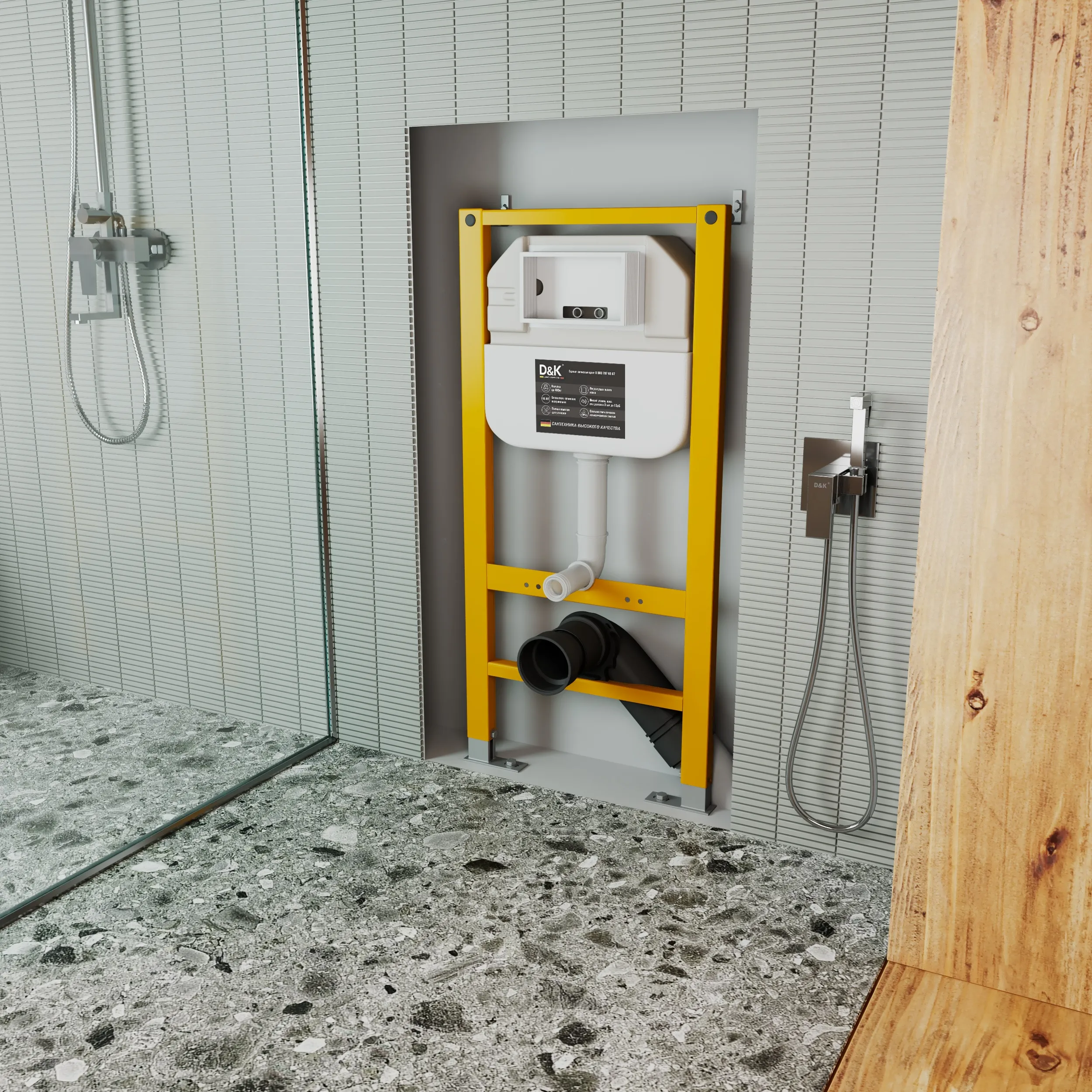 Инсталляция D&K - это система креплений и приспособлений, позволяющих произвести установку подвесного унитаза. Крепится она к стене или за специальным декоративным коробом. На раму устанавливается чаша подвесного унитаза, сливной бачок, различные приспособления и механизмы, вентили и краны, предохранительные клапаны. Также система инсталляции позволяет подключать трубы для подачи и отведения воды.