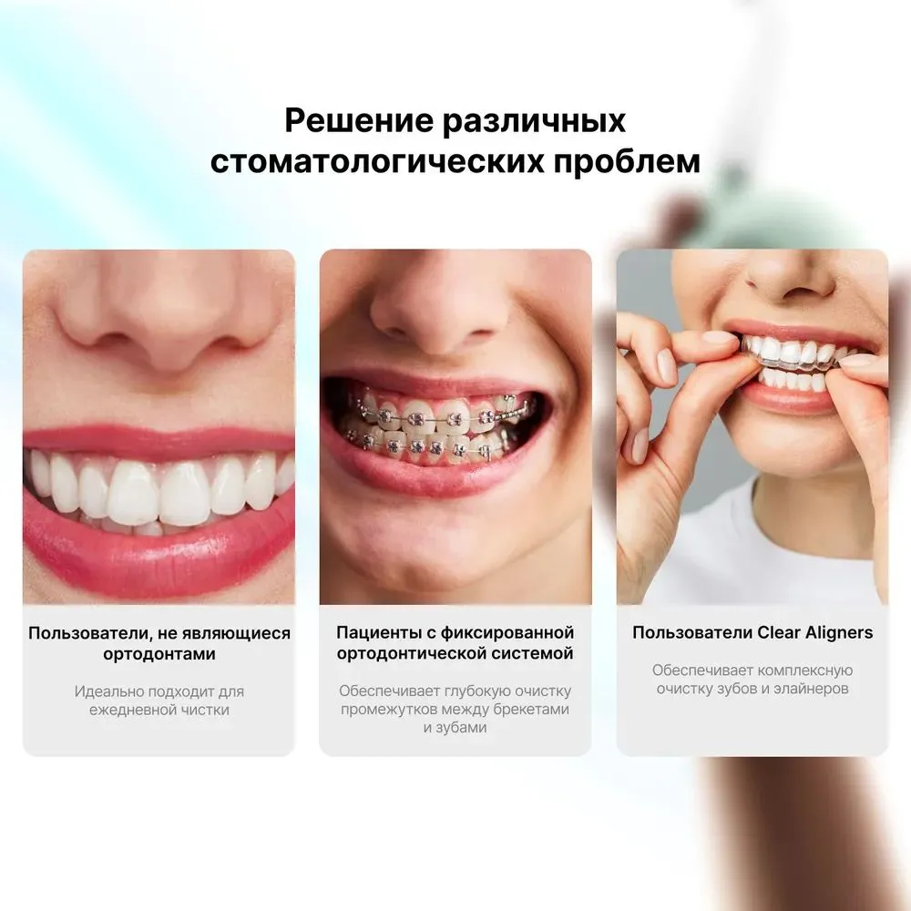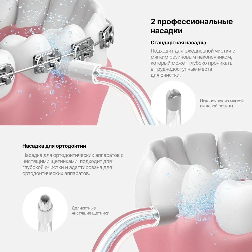 Портативный ирригатор Oclean A10 размером с ладонь в нескользящем и устойчивом к плесени дизайне корпуса. Имеет три режима: стандартный режим - подходит для ежедневной чистки для большинства людей, мягкий режим - подходит для людей с чувствительными зубами и деснами, режим массажа - подходит для людей с чрезвычайно чувствительной полостью рта. В комплекте стандартная и ортодонтическая насадки. Комбинируйте струи сжатого воздуха и воды с содержанием воздуха до 98%, чтобы мягко и эффективно удалять остатки пищи между зубами, улучшая здоровье полости рта.
