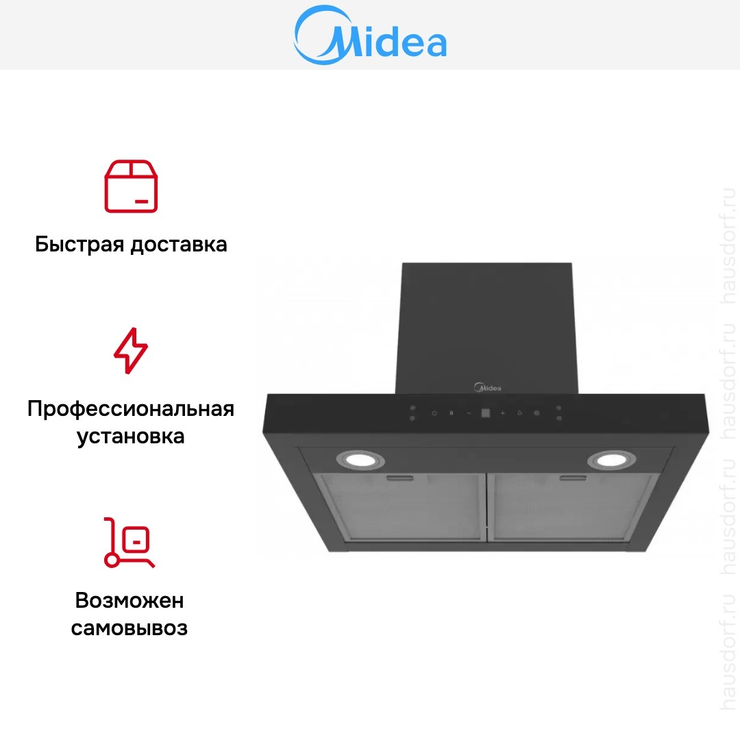 наклонная вытяжка midea mh60c668gb, 60 см, мощность 80 вт, режимы отвода и рециркуляции, черного цвета.