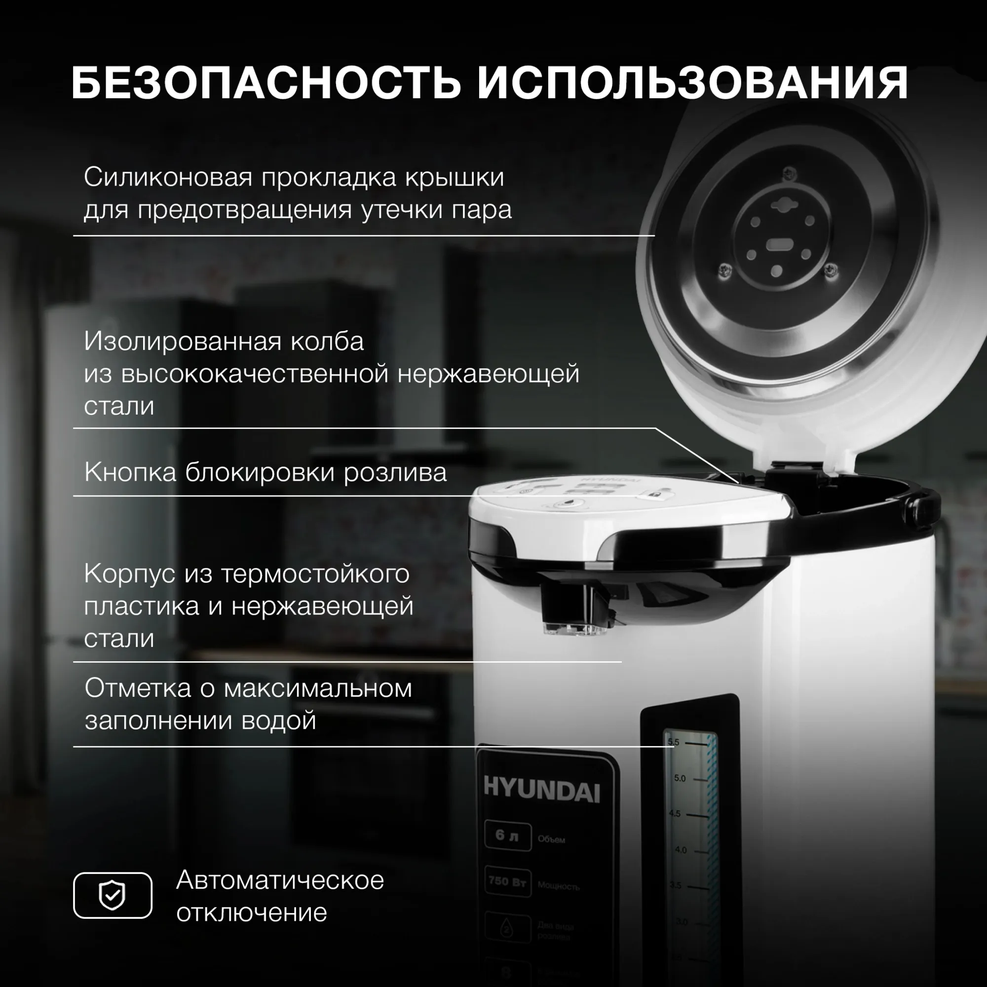 Описание товара Термопот Hyundai HYTP-4850 6л. 750Вт белый/черный