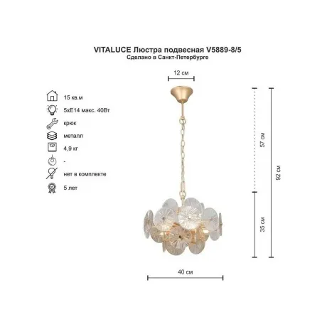 люстра vitaluce v5889-8/5 в стиле модерн, 5 ламп e14, максимальная мощность 40 вт, общая максимальная мощность 200 вт, площадь освещения 15 кв.м.