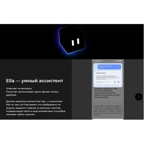 Базовая модель в серии стильных камерофонов Camon 40 со встроенным умным ассистентом Ella на базе TECNO AI. Умный ассистент Ella с поддержкой русского языка понимает голосовые команды и выполняет запросы — от редактирования фото до вызова такси. Tecno CAMON 40 также оснащён функциями генерации текстов и картинок, умного поиска в интернете, решения математических задач, переводчиком в реальном времени и возможностью расшифровки аудиозаписей и звонков. И это только небольшая часть доступных опций встроенного искусственного интеллекта.