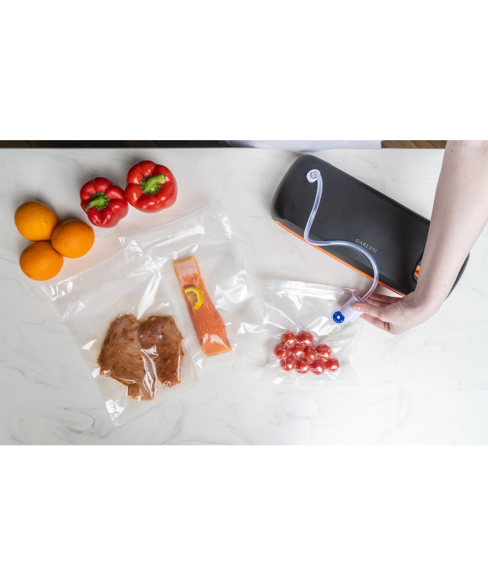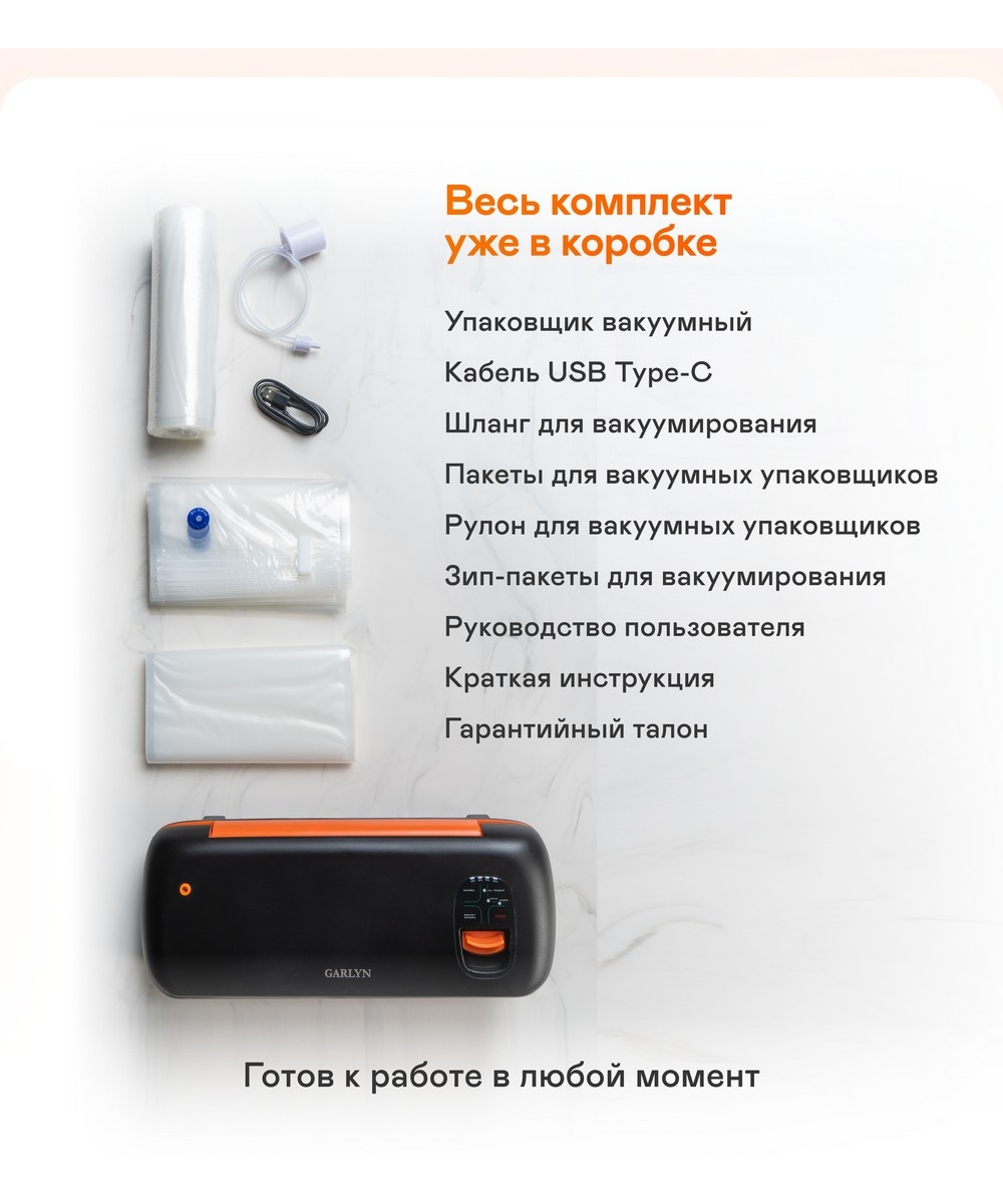 Кабель USB Type-C; шланг для вакуумирования; пакеты для вакуумных упаковщиков GARLYN 20 ? 30 см (10 шт.); рулон для вакуумных упаковщиков GARLYN 22 ? 600 см; зип-пакеты для вакуумирования 20 ? 22 см (15 шт.); руководство пользователя; краткая инструкция пользователя; гарантийный талон