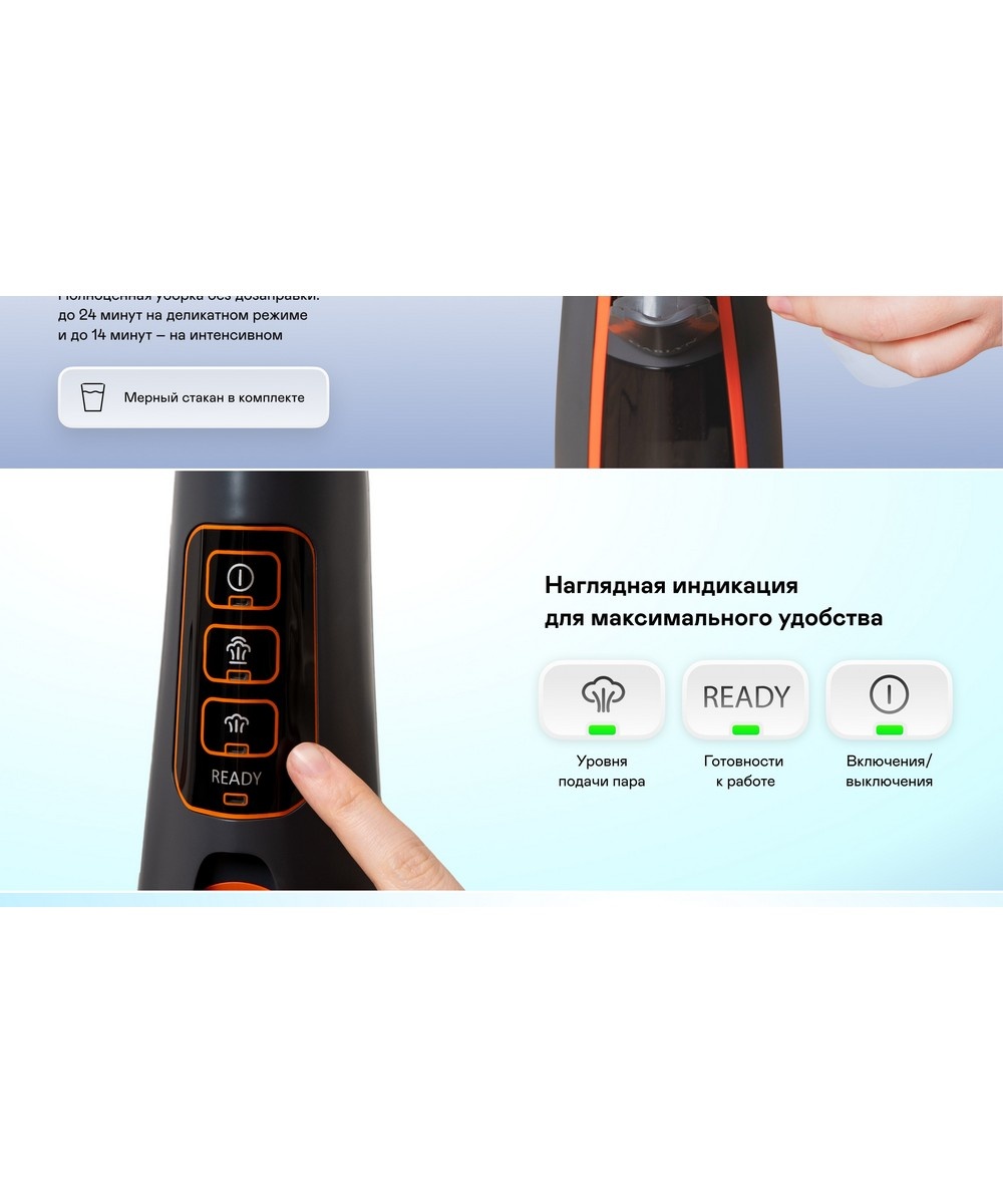 Готовность к работе через 15 секунд Два режима: деликатный и интенсивный Максимальная подача пара до 40 г/мин Манёвренность для уборки в труднодоступных местах