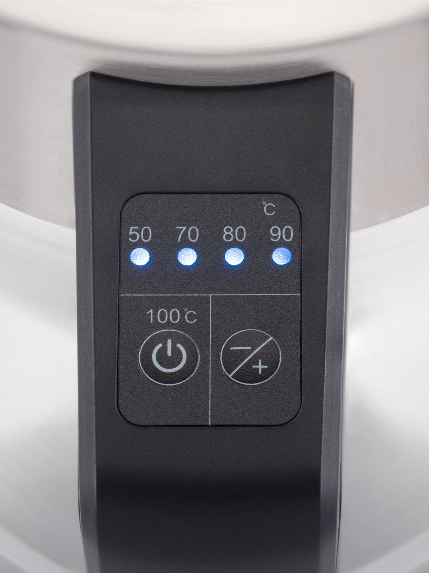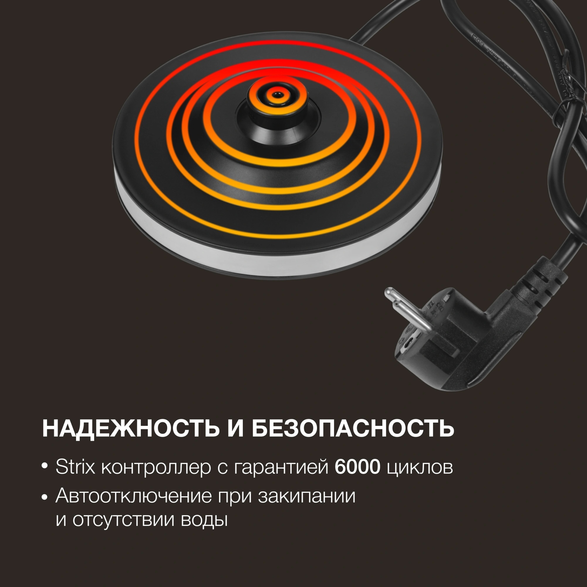 Объём чайника составляет 1,7 литра, что идеально подходит для семьи из нескольких человек или для приёма гостей. Вам больше не нужно будет многократно подходить к прибору, чтобы напоить всех домочадцев. А благодаря прозрачной колбе из прочного стекла вы всегда можете визуально контролировать количество жидкости. Этот практичный индикатор уровня воды дополнен специальной разметкой, что обеспечивает максимальную точность и удобство. Элегантный стеклянный корпус не только выглядит современно и стильно, но и демонстрирует всю красоту кипящей воды, добавляя процессу эстетическое удовольствие.