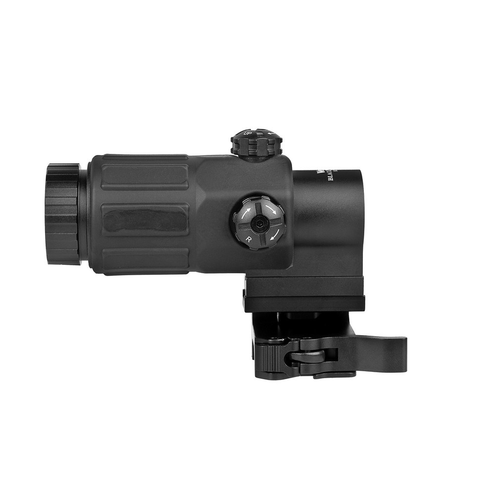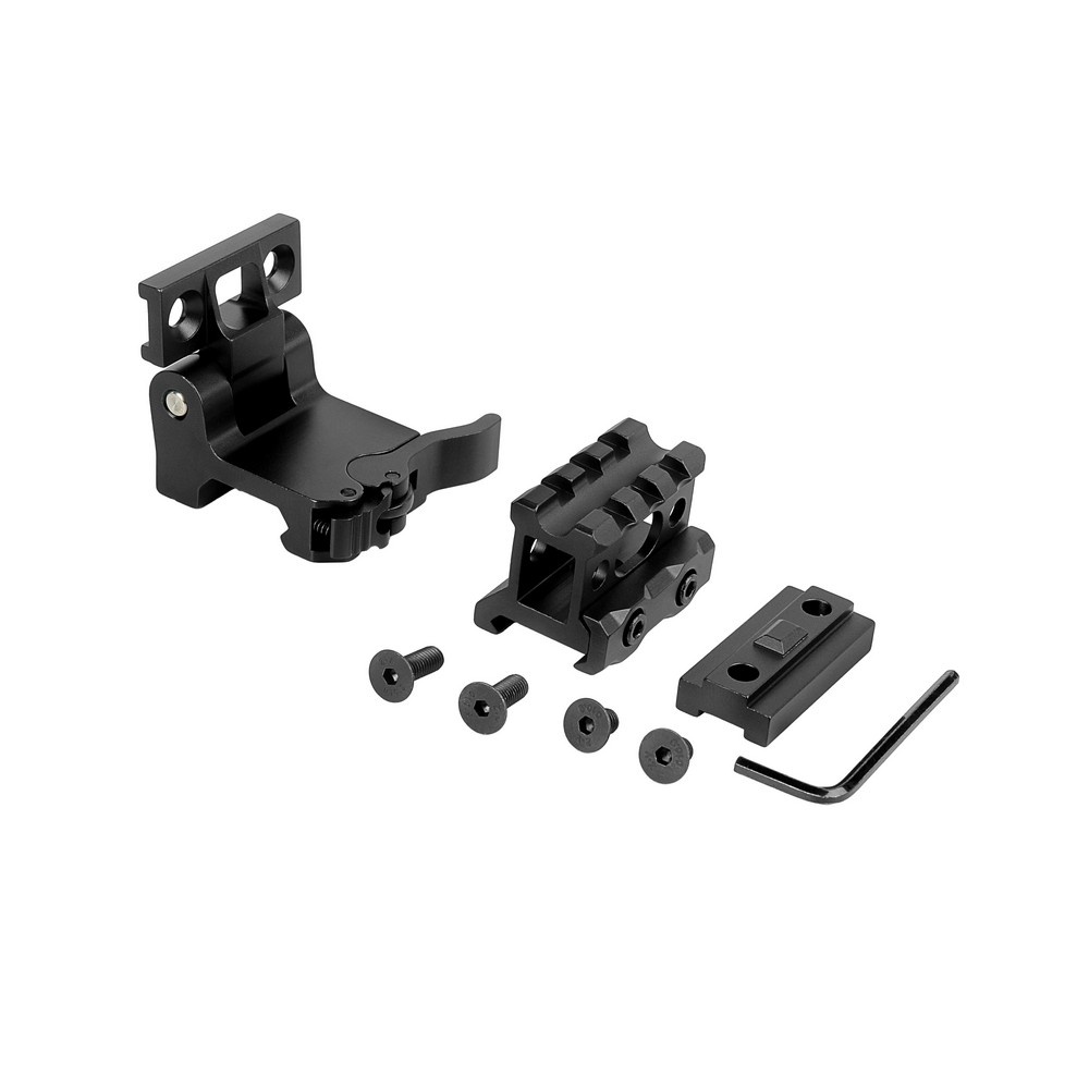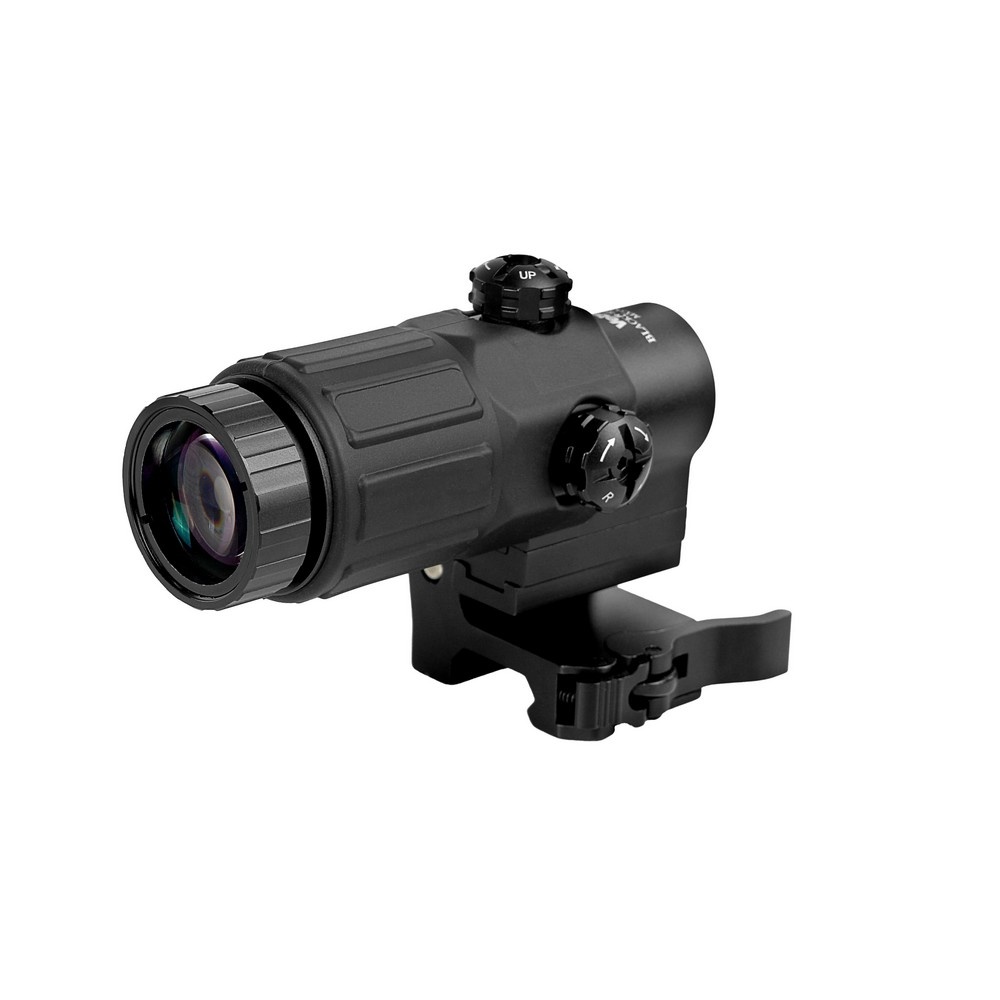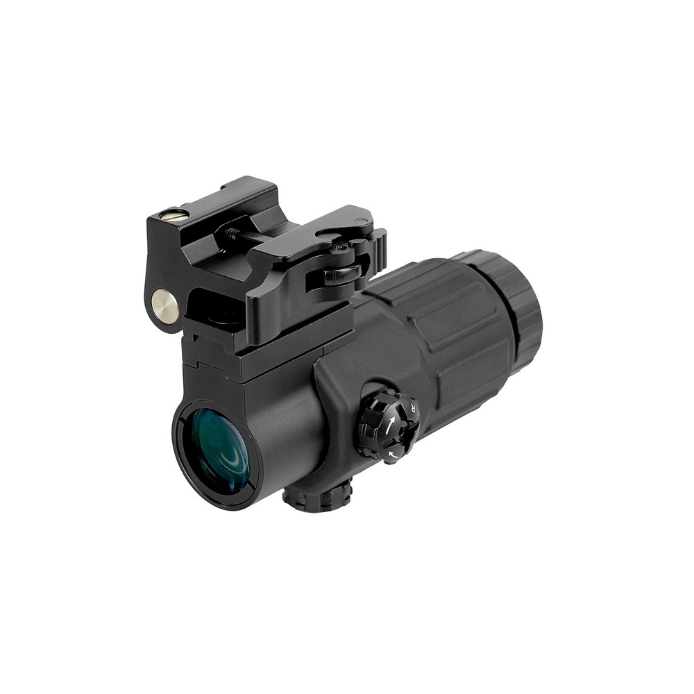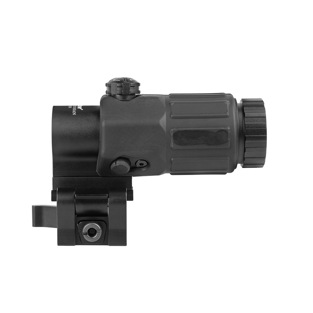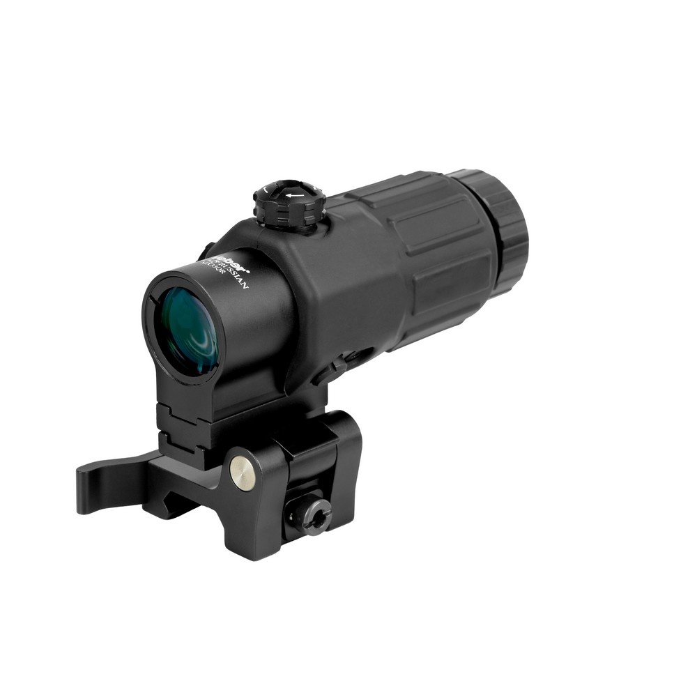 Увеличитель устанавливается на откидное крепление для планки Weaver при помощи двух винтов (имеются в комплекте). Использование этого крепления дает возможность быстро переходить с ведения огня с дальней дистанции на ближнюю и, наоборот, увеличивая кратность коллиматорного прицела с 1х до 3х. Для этого нужно одним нажатием кнопки фиксатора откинуть увеличитель на угол 90°. Быстросъемное крепление позволяет снимать/ставить увеличитель, не сбивая его настройки.