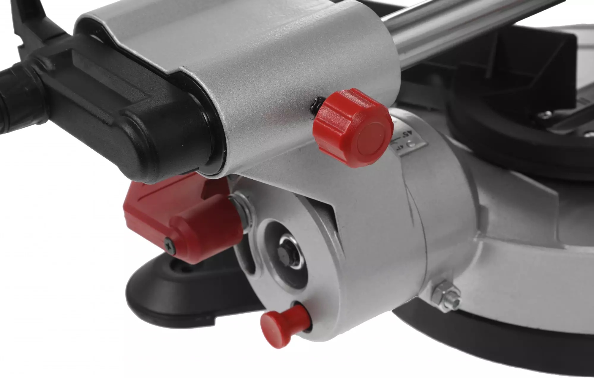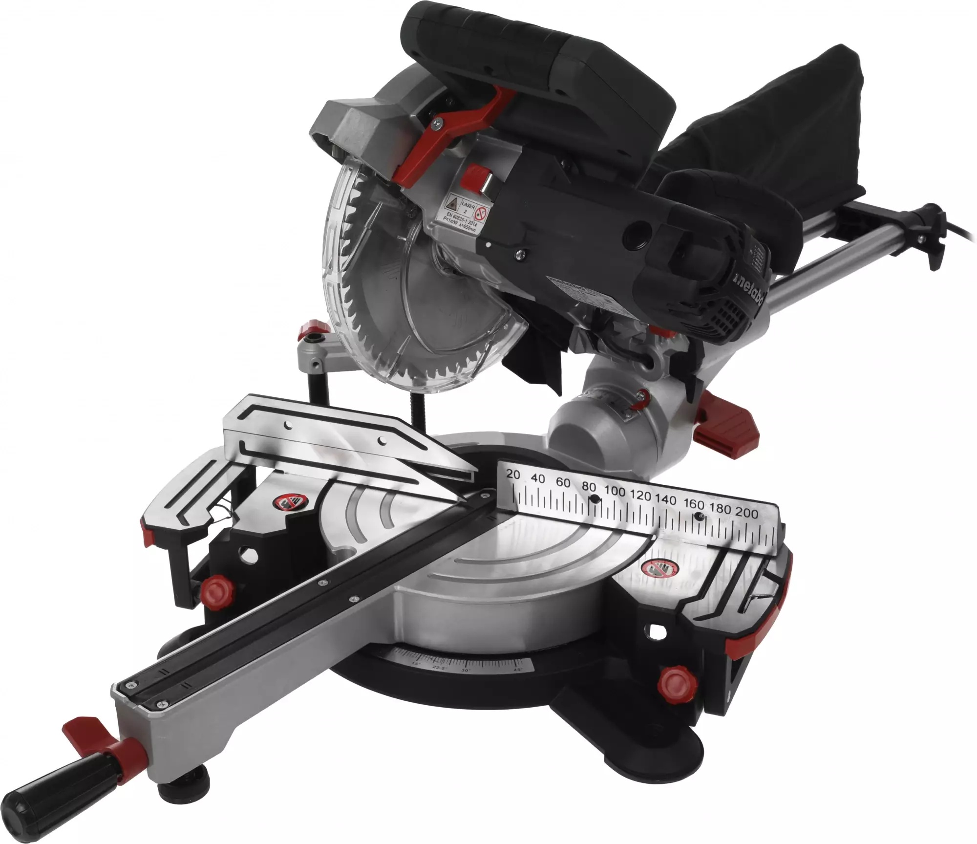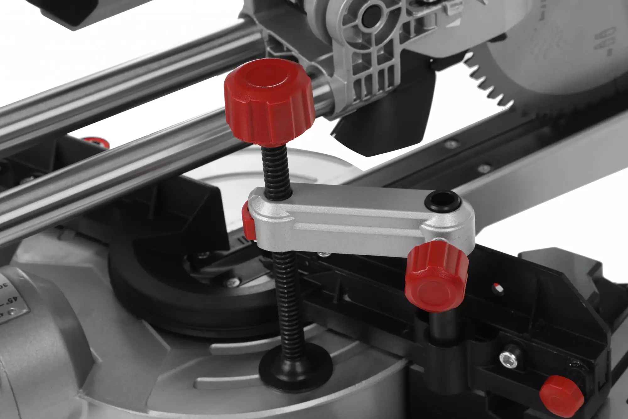 Торцовочная пила, твердосплавное пильное полотно (60 зубьев), 2 встроенных расширения стола, торцовочный упор, зажим для материала, инструмент для смены пильного диска, намотка кабеля, мешок для сбора опилок.
