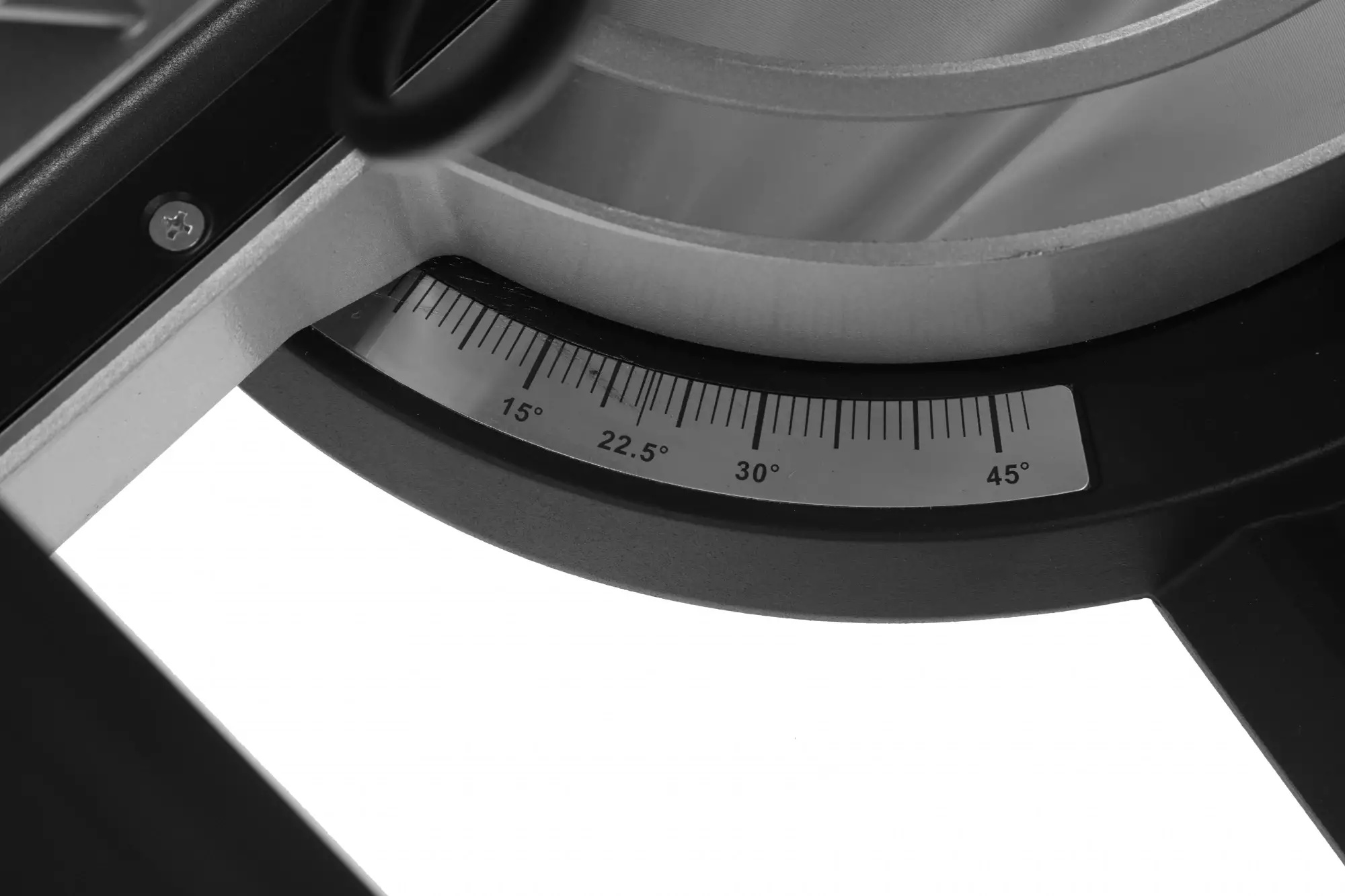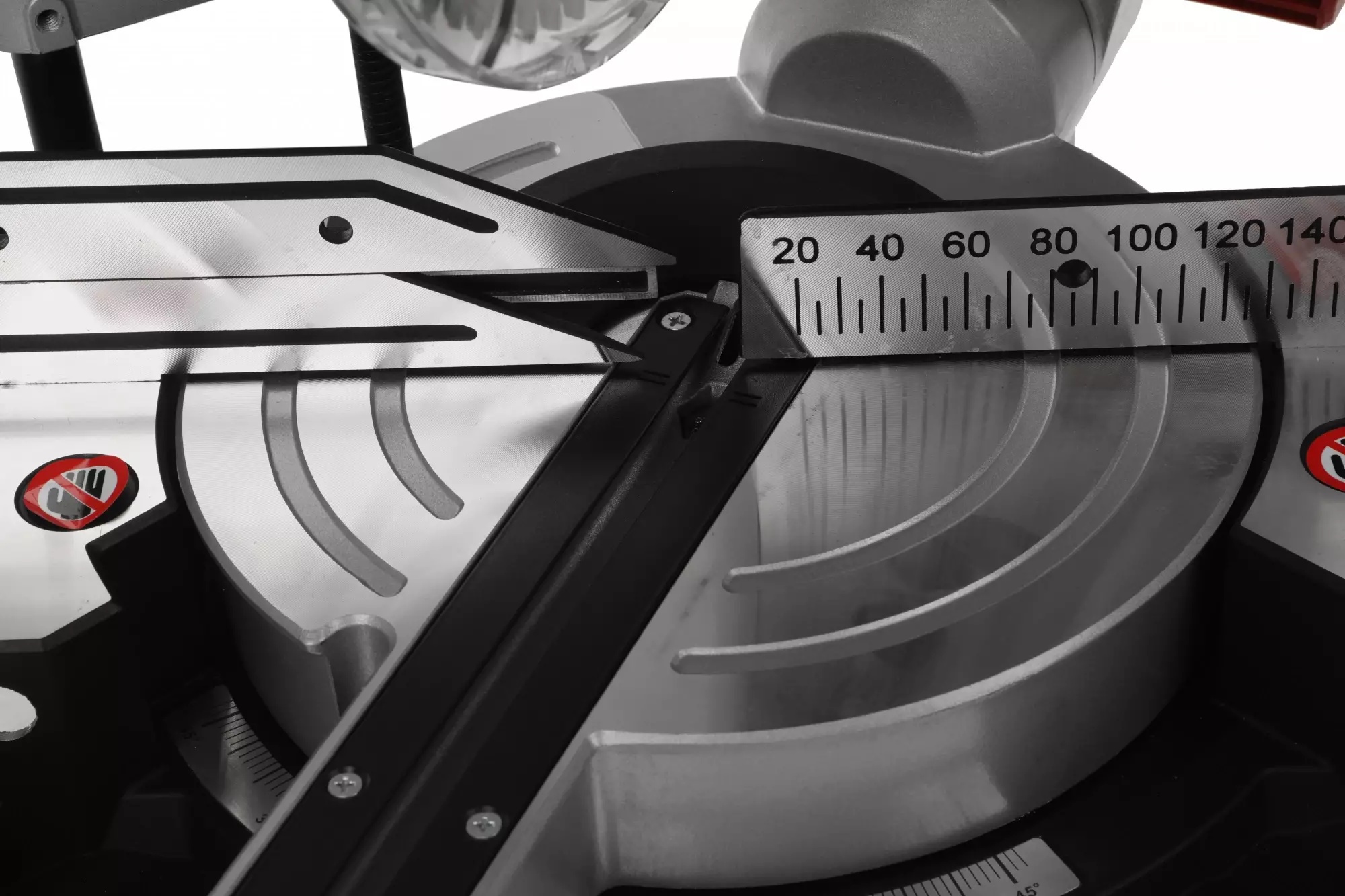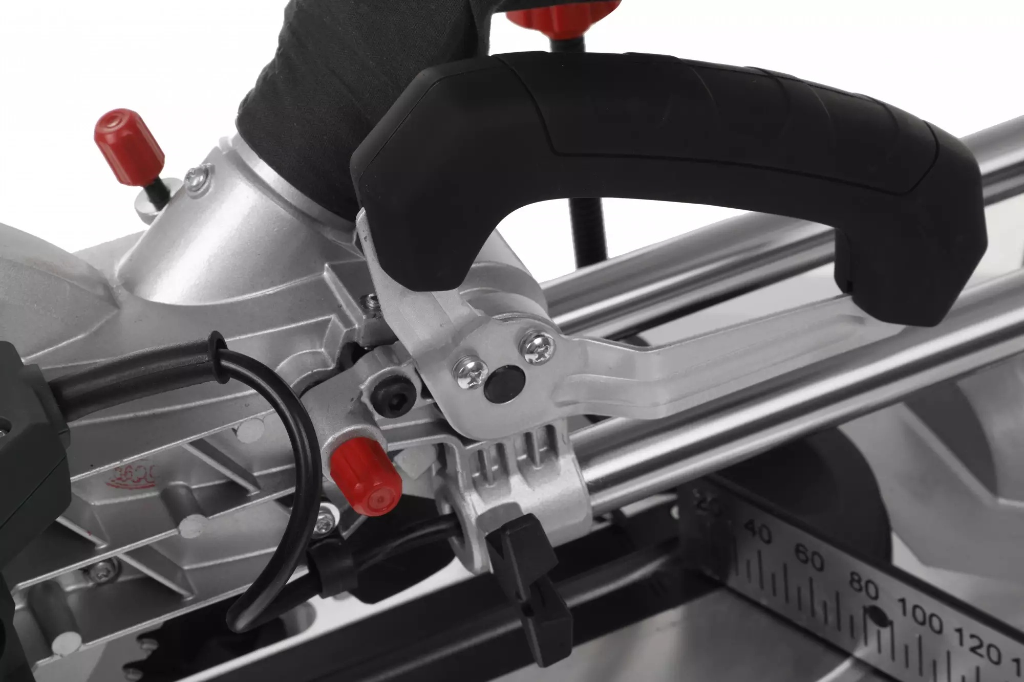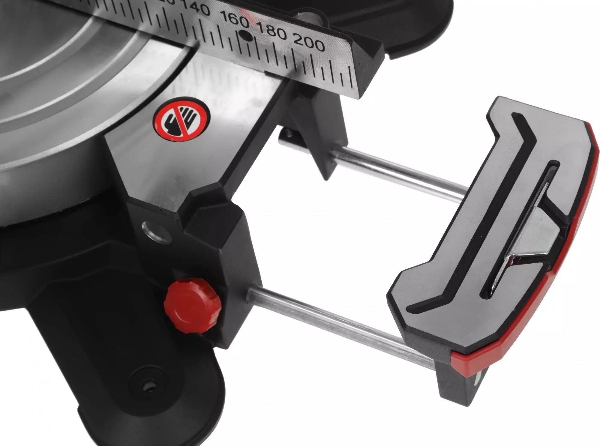 Торцовочная пила, твердосплавное пильное полотно (60 зубьев), 2 встроенных расширения стола, торцовочный упор, зажим для материала, инструмент для смены пильного диска, намотка кабеля, мешок для сбора опилок.