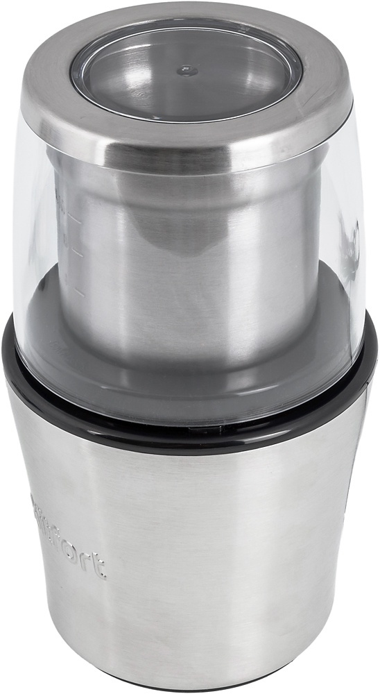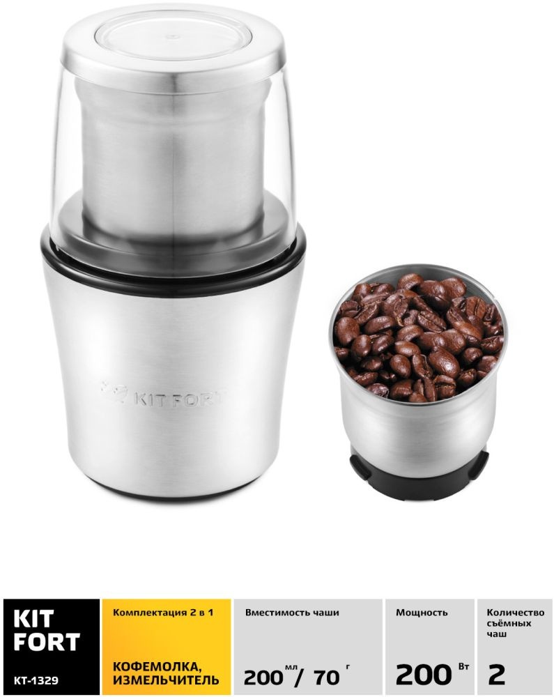 Мощная кофемолка «2 в 1» Kitfort KT-1329 в корпусе из нержавеющей стали предназначена для помола кофейных зёрен и измельчения специй и орехов. Она укомплектована прозрачной крышкой и двумя съёмными чашами. Первая чаша оснащена двухсторонним ножом для кофейных зёрен (дробилкой), вторая — четырёхсторонним ножом для измельчения.