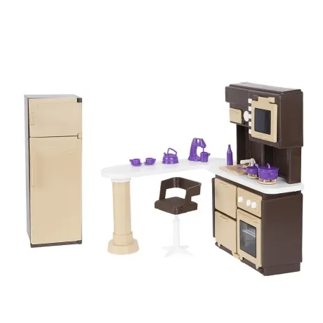 Прекрасный набор кухонной мебели: стильный шкаф с необходимой техникой, раковиной, барной стойкой и холодильник. В набор так же входит комплект посуды и миниатюрные игрушки-продукты. Любой ребенок обрадуется миниатюрным сковородкам, чашечкам, пачкам с молоком и многому другому!